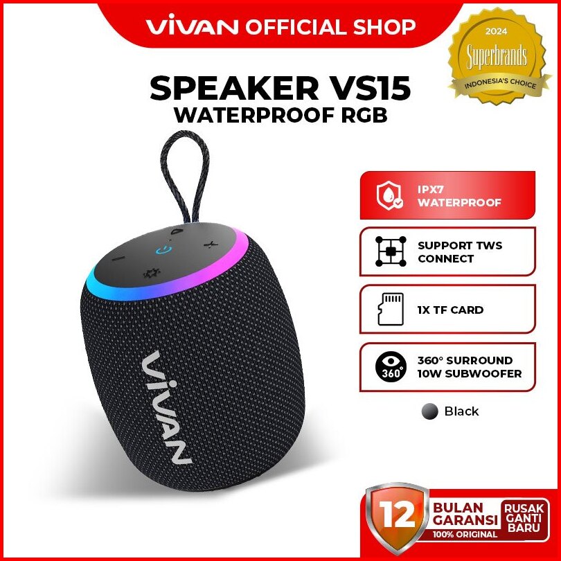 Vivan Bluetooth Speaker Vs15 Sound 360 Waterproof Ipx7 Hi-fi Super Bass Rgb Light Garansi 12 Bulan