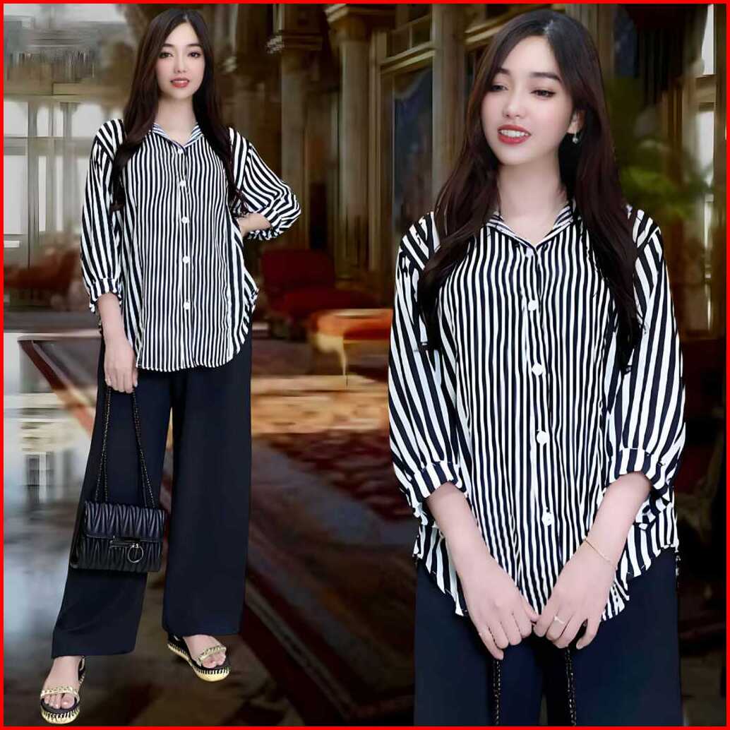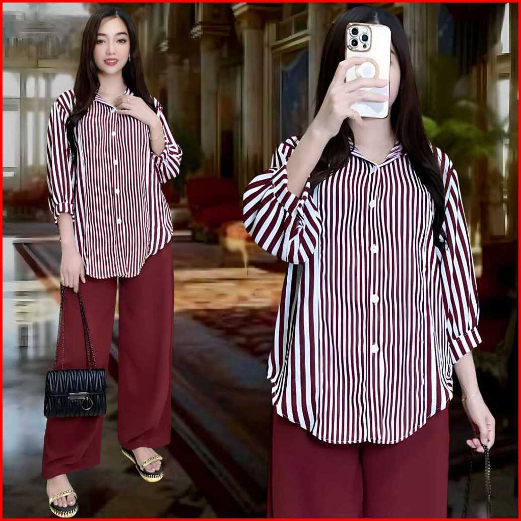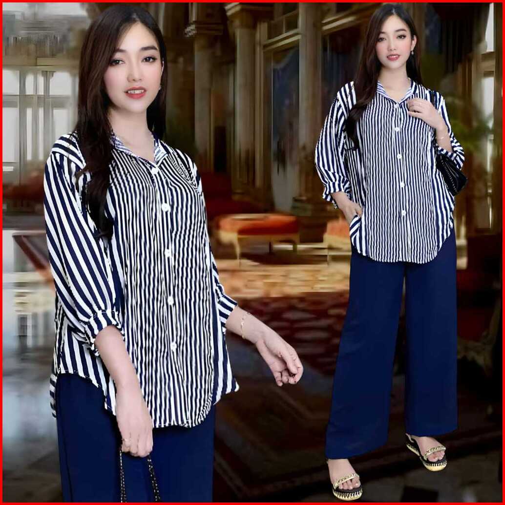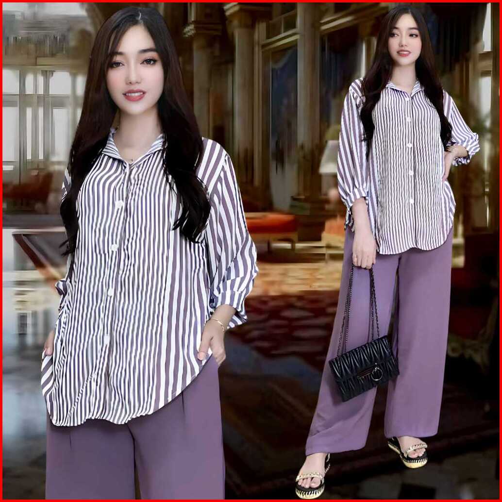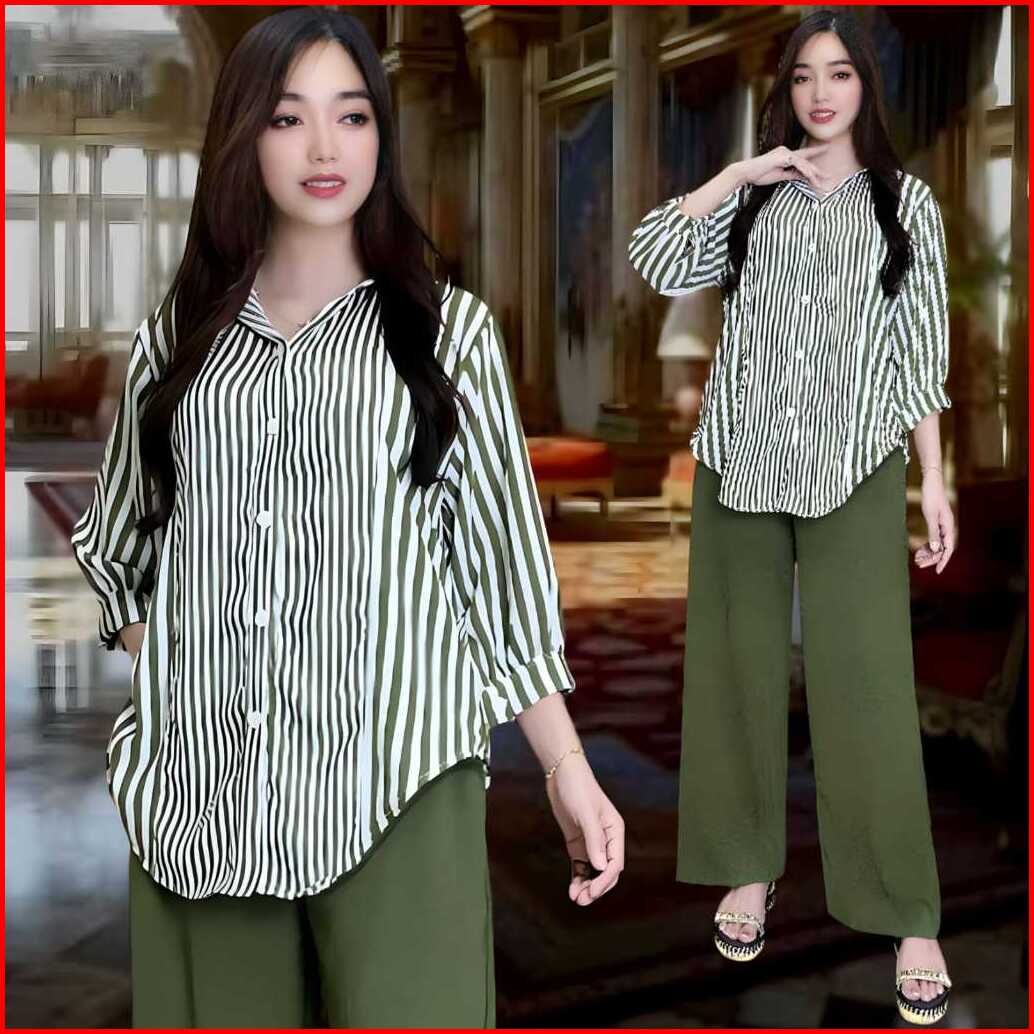 Aisyah Setelan Crincle Wanita Kekinian Ld 120 Atasan Kemeja Oval Celana Lurus Bahan Crincle Airflow