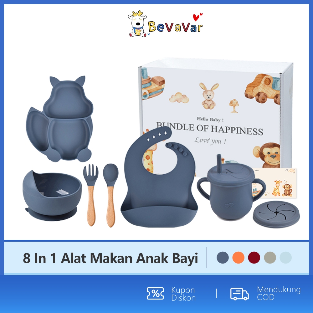 BEVAVAR 8 in 1 Tempat Makan Bayi Silicone Set / Mangkok Piring Sendok Garpu Bib Cup Silikon Peralatan Makan Bayi Set