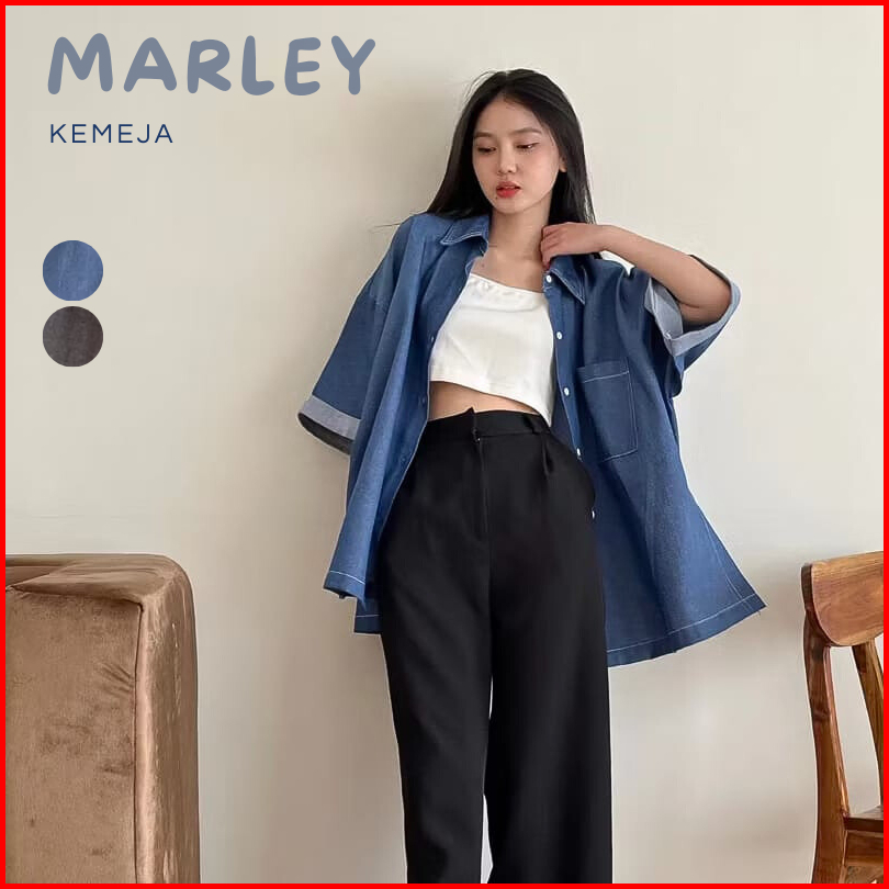 Kemeja Jeans Denim Oversize Lengan Pendek Outfit Casual Wanita - Marley