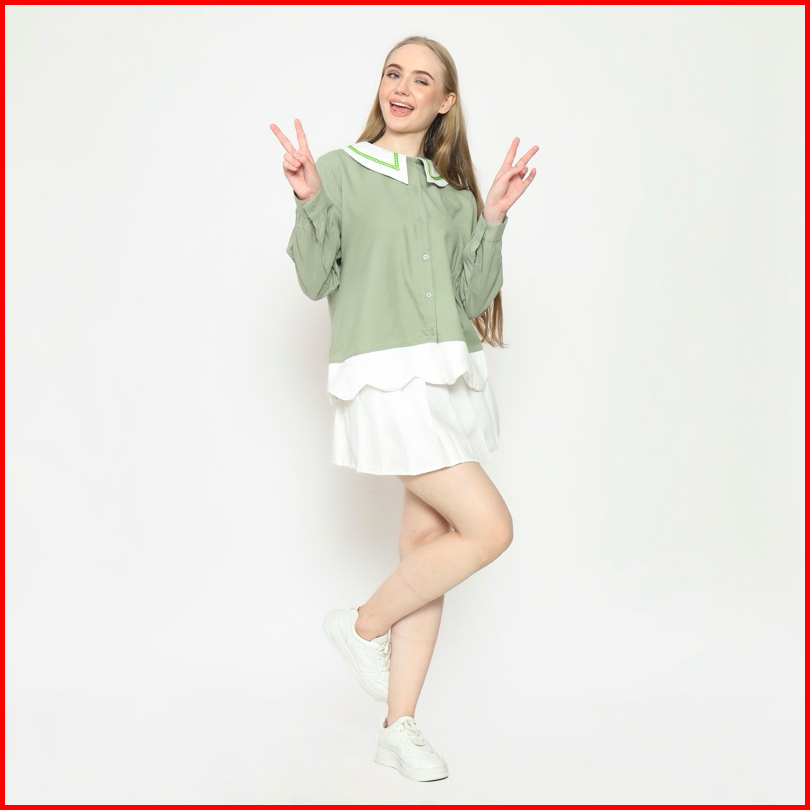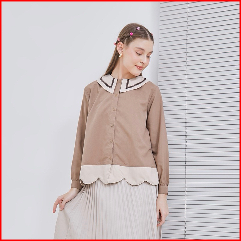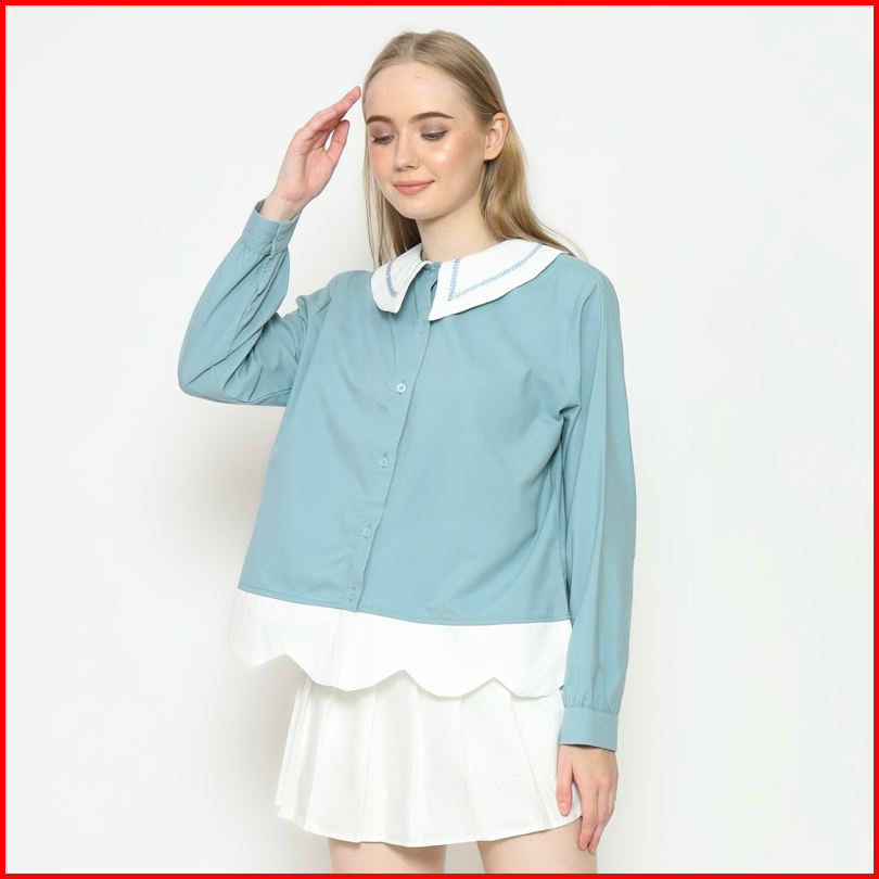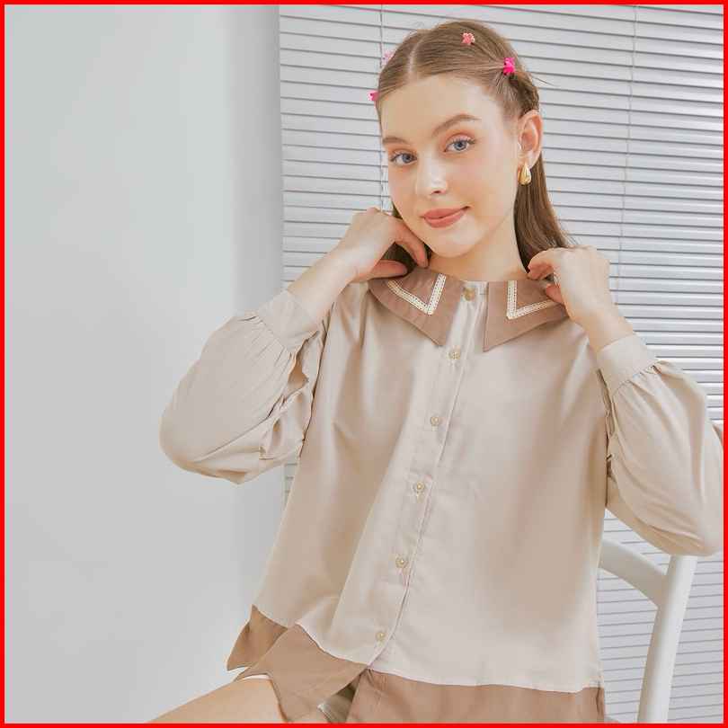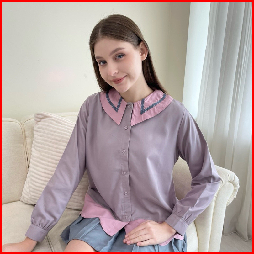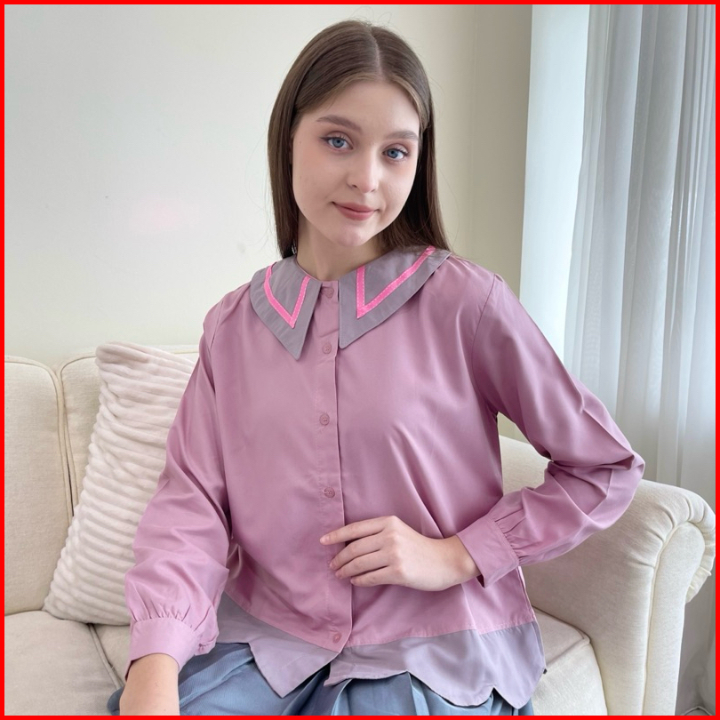 Senchi - Yumeko Two-tone Shirt Kemeja Halus Wanita Dua Warna Atasan Kemeja Wanita Style Jepang Korea