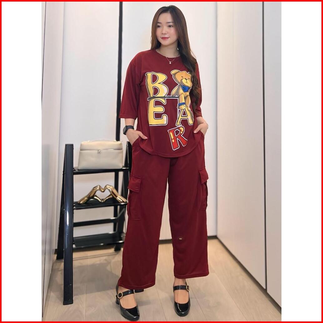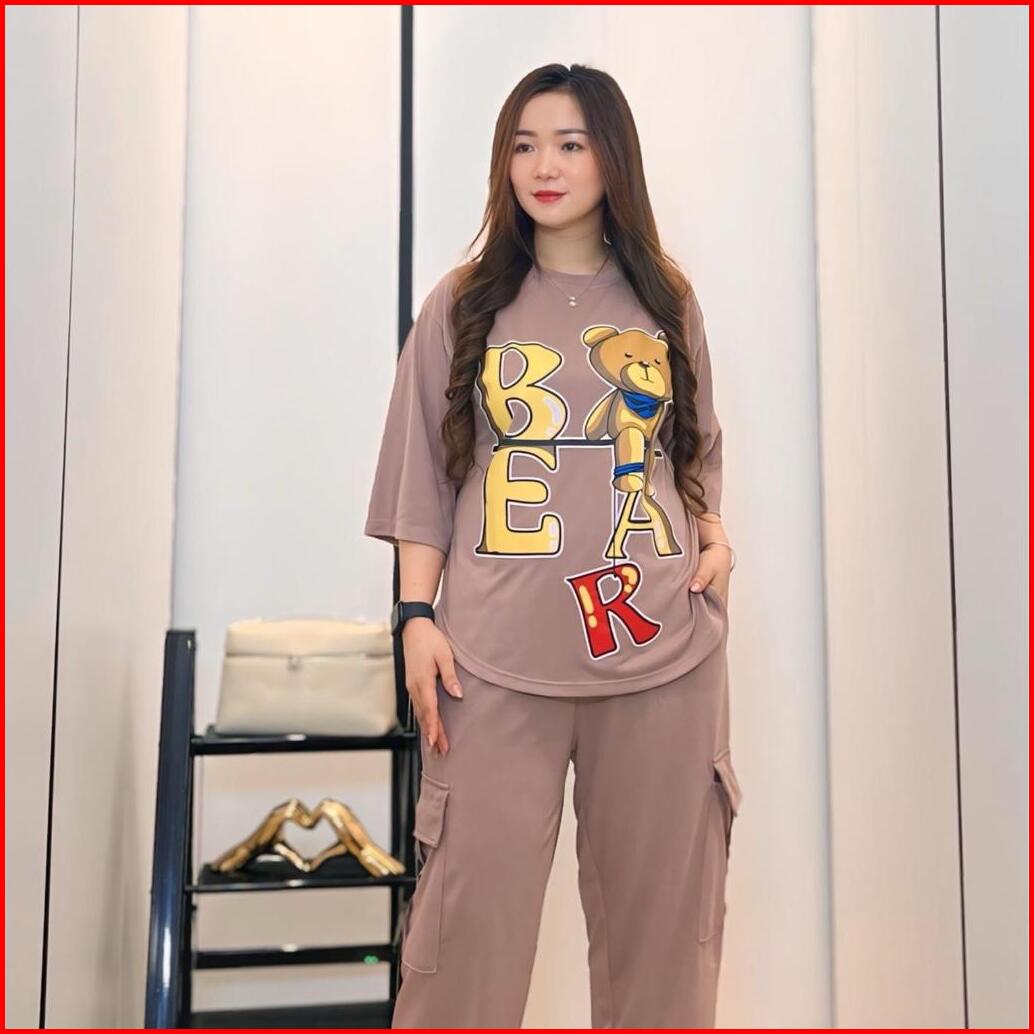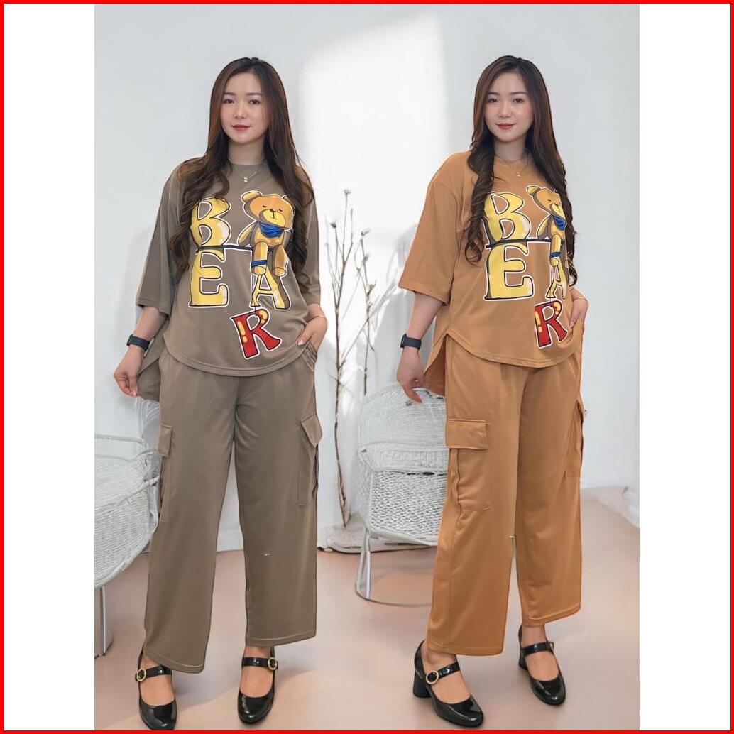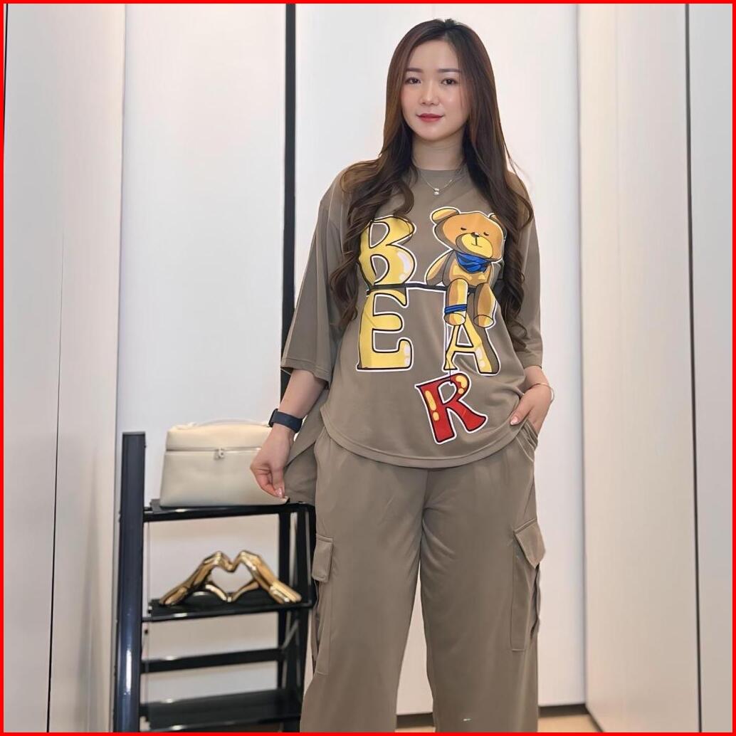 Gr Setelan Cargo Oversize Ld 120 Cm Setelan Wanita Atasan Lengan 3 4 Dan Celana Cargo Setelan Bear Fashion Muslim Sr5362