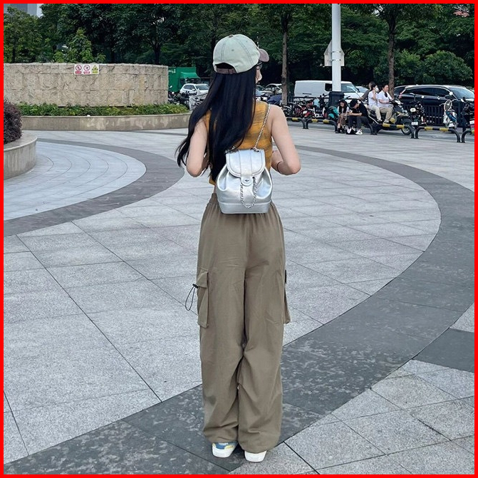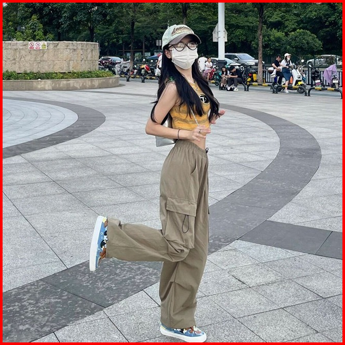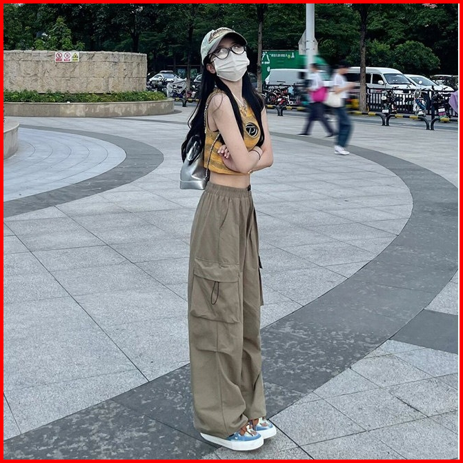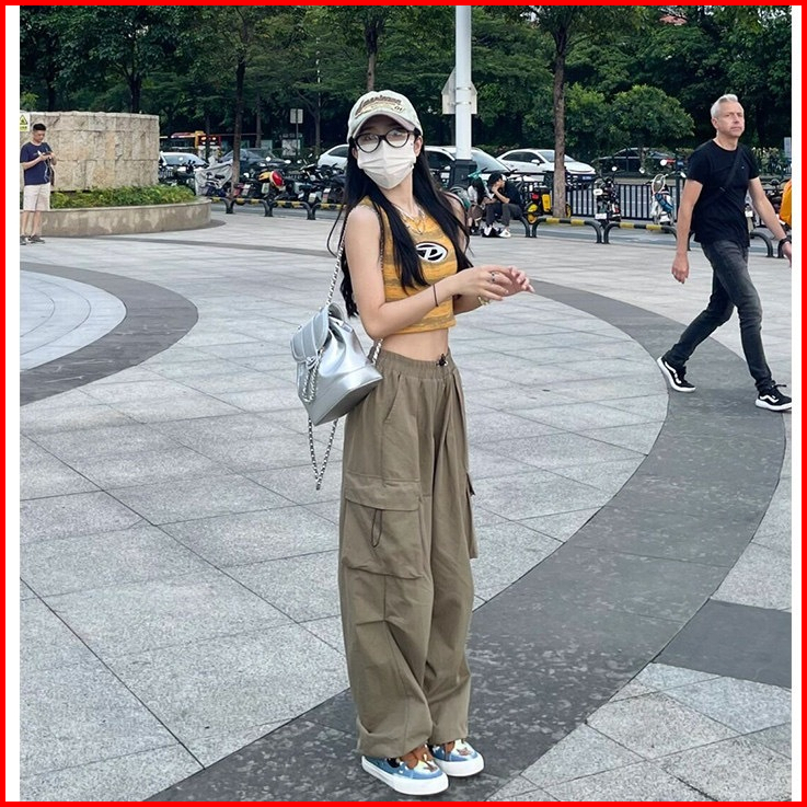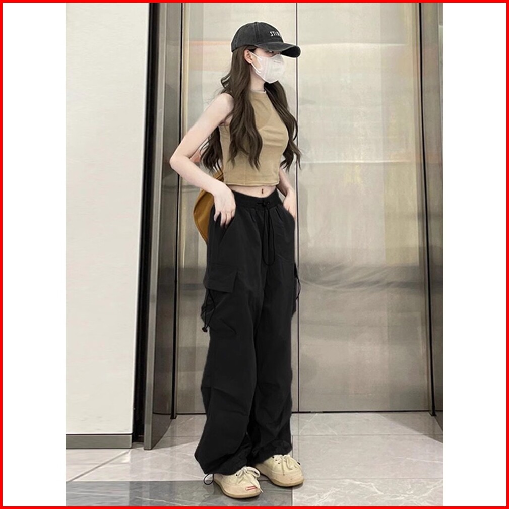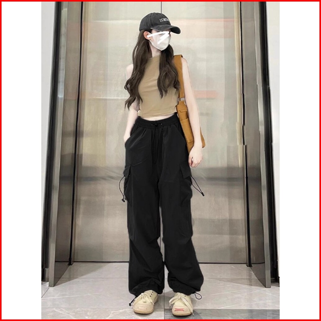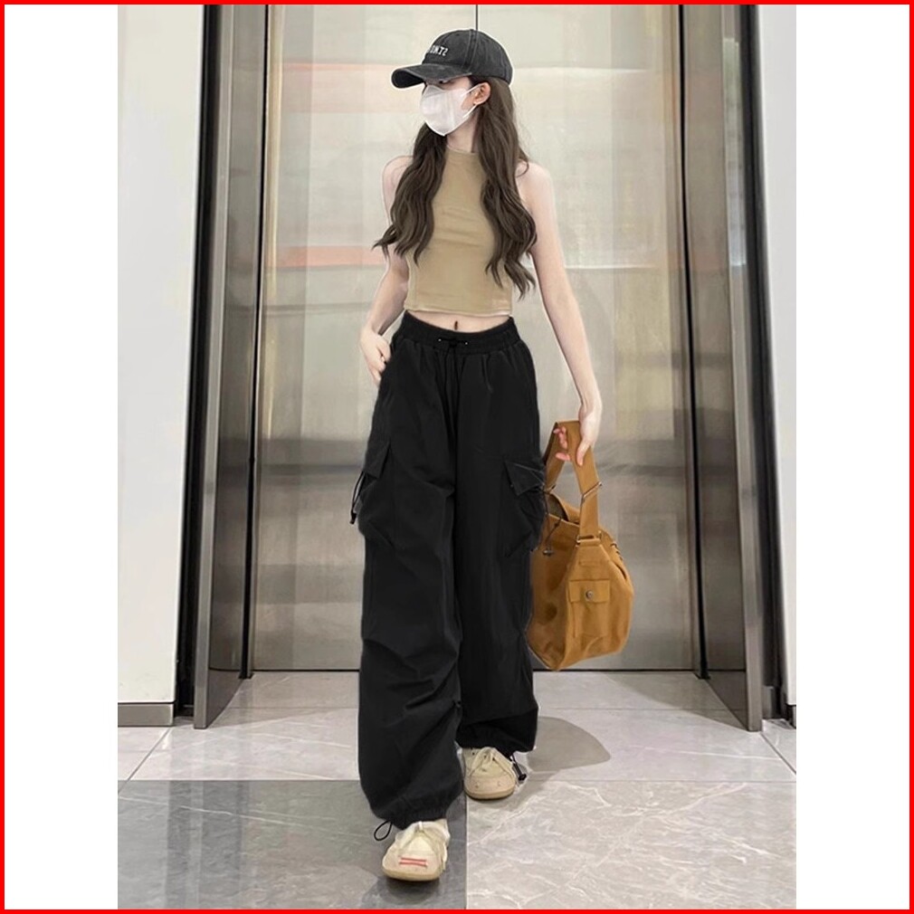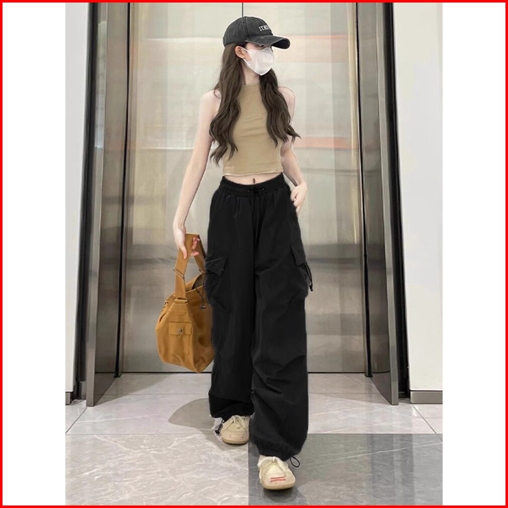 Celana Wanita Kekinian Kulot Highwaist Celana Cargo Wanita American Retro Straight Wide Leg Celana Panjang Hitam Premium