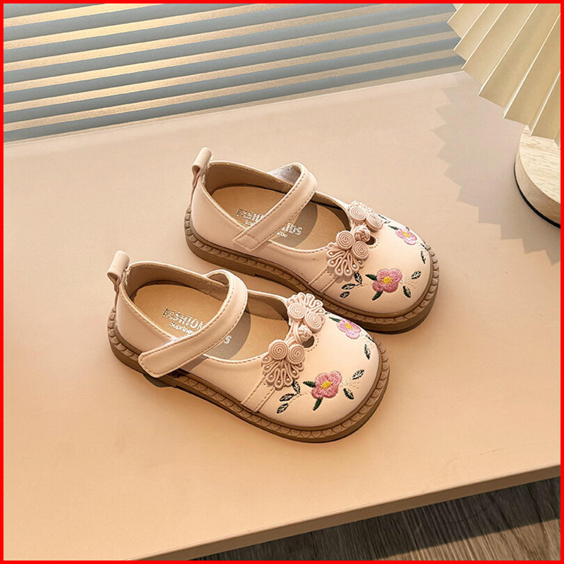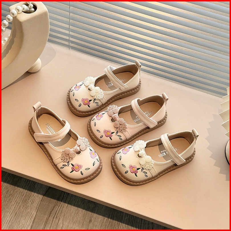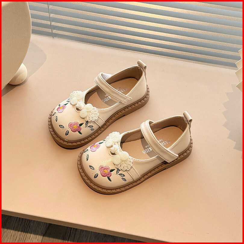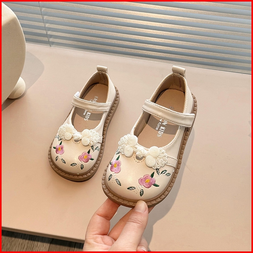 Sepatu Datar Kulit Bayi Perempuan Bunga Bordir Gaya Kuno Sepatu Anak-anak Antilicin Sol Lembut Ujung Bulat Gaya Korea 2-
