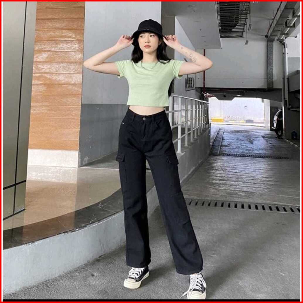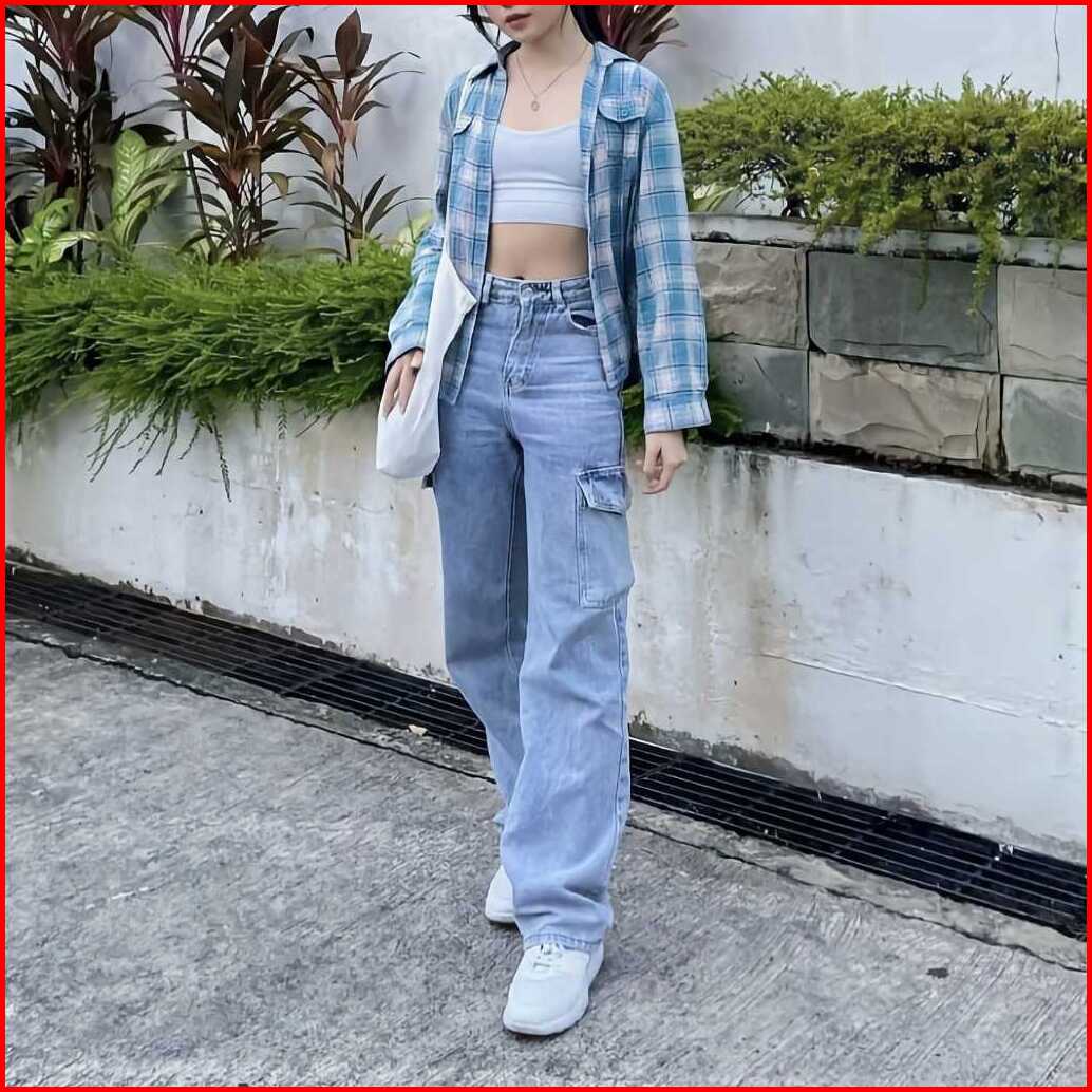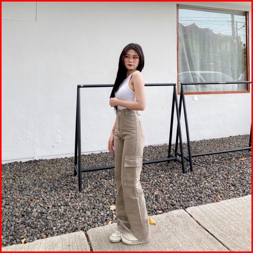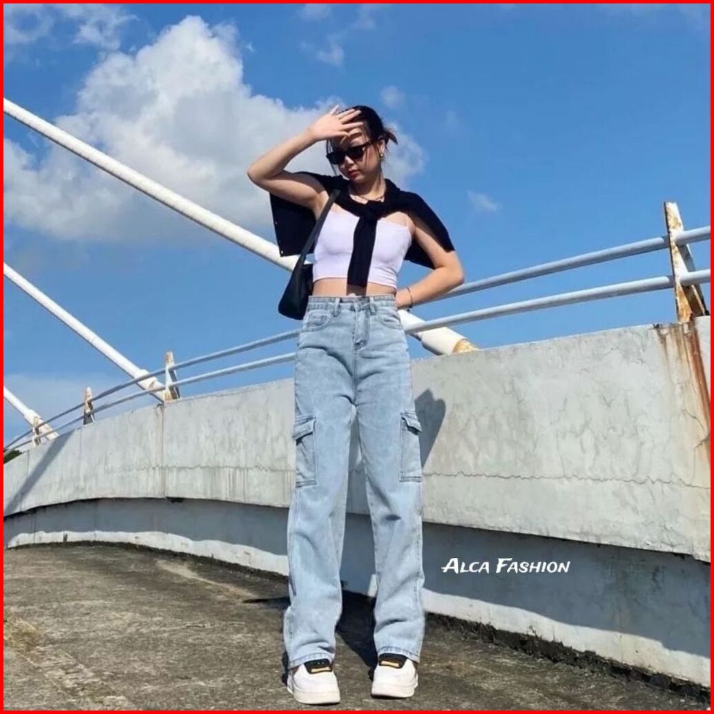 Celana Cargo Highwaist Loose Jeans Baggy Wanita Kulot Cargo Highwaist