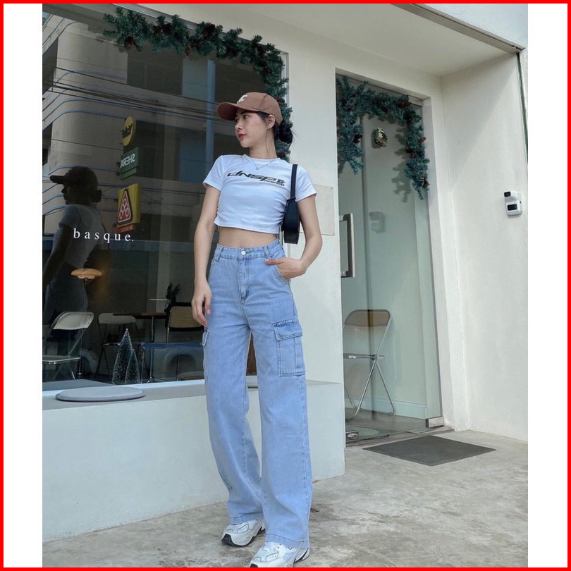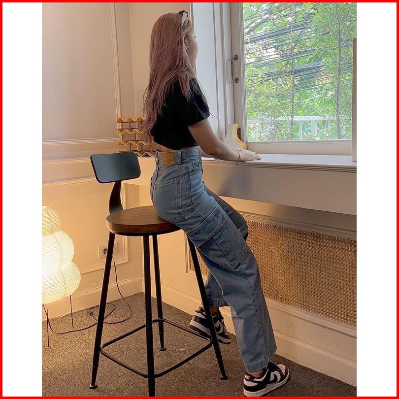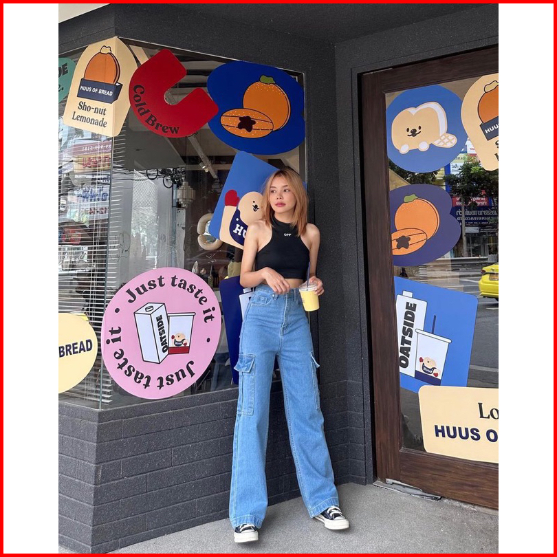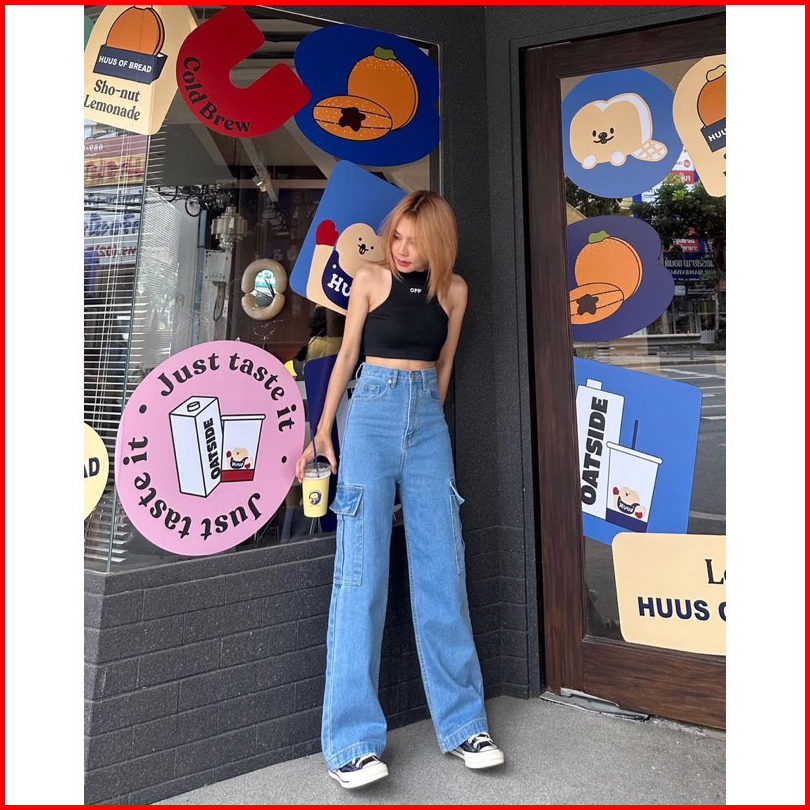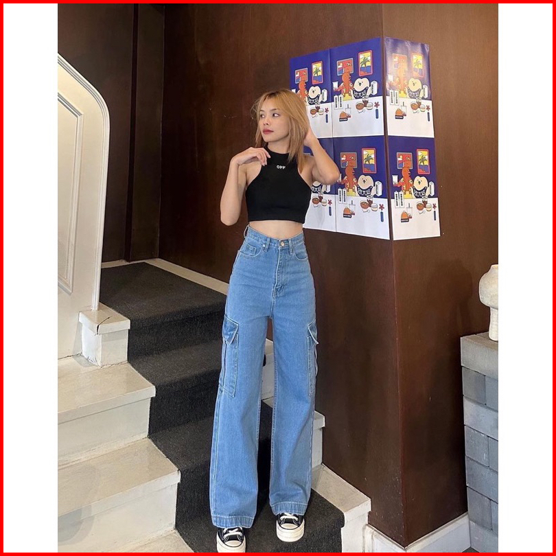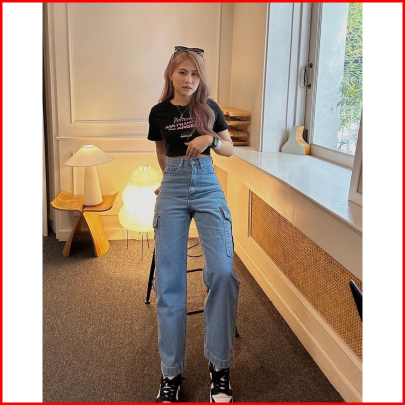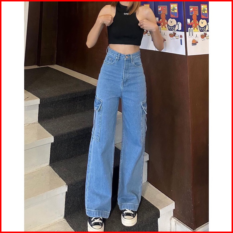 Celana Cargo Jeans Wanita Highwaist Premium Free Belt