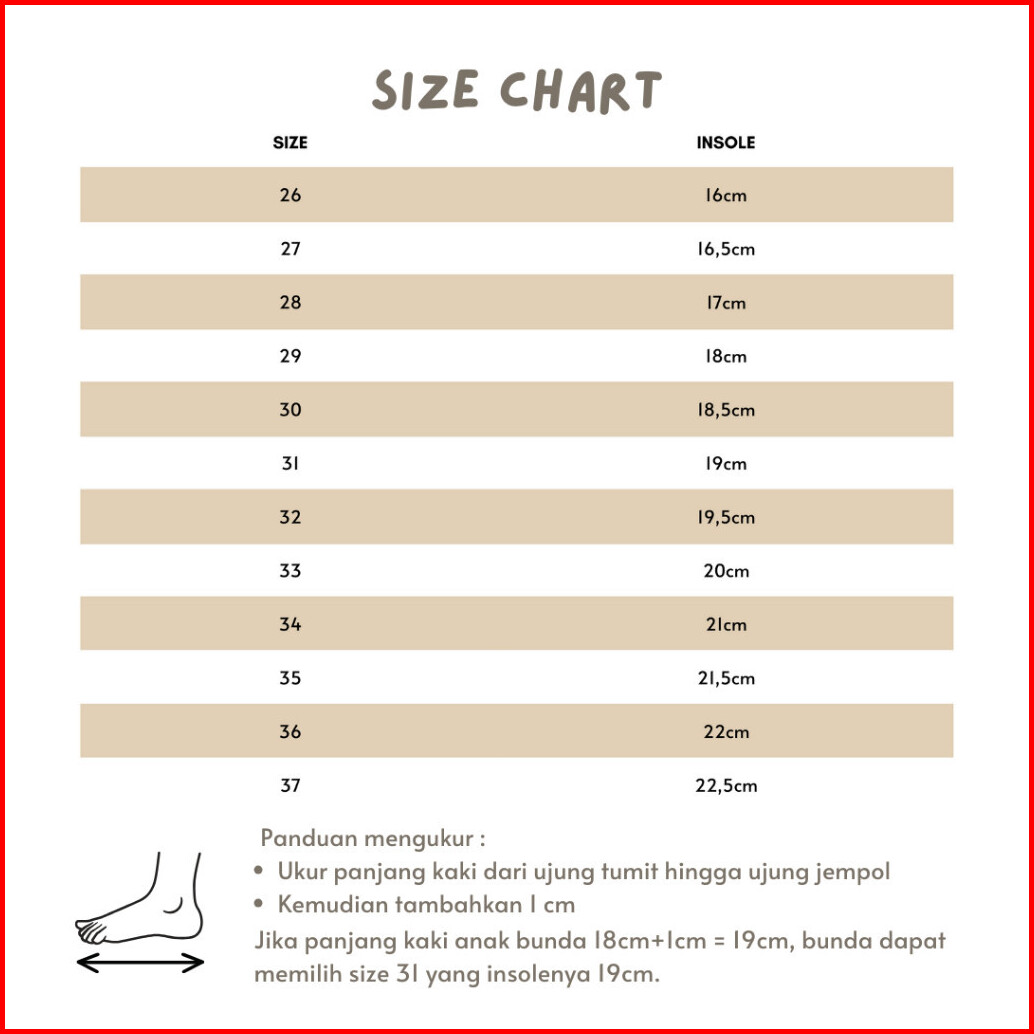 Size 26 (16cm), Size 27 (16,5cm), Size 28 (17cm), Size 29 (18cm), Size 30 (18,5cm), Size 31 (19cm), Size 32 (19,5cm), Size 33 (20cm), Size 34 (21cm), Size 35 (21,5cm), Size 36 (22cm), Size 37 (22,5cm)