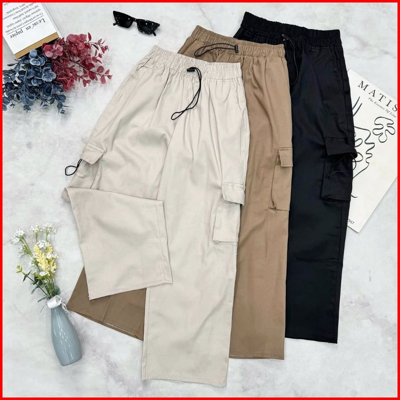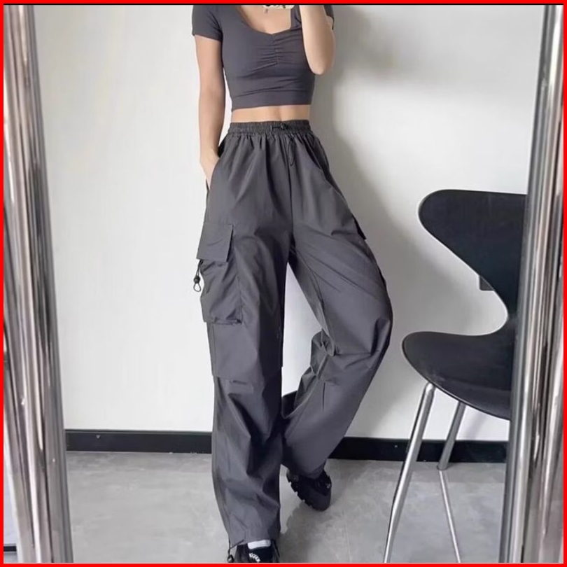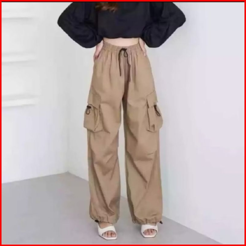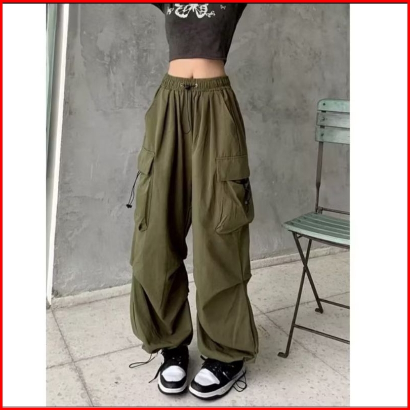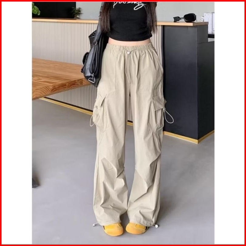 Celana Cargo Pants Wanita Highwaist Loose Korean Style Bahan Katun American Drill Standar Jumbo Celana Kargo Parasut Wan