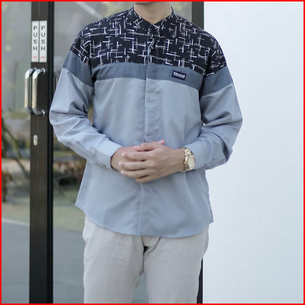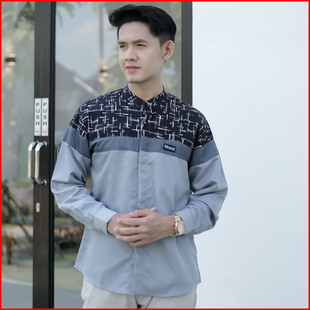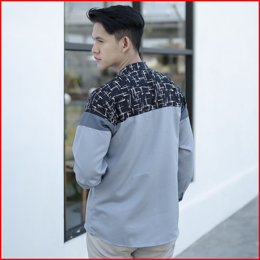Baju Koko Pria Elrumi Lengan Panjang Warna Abu-abu Kombinasi Batik Motif Senopati