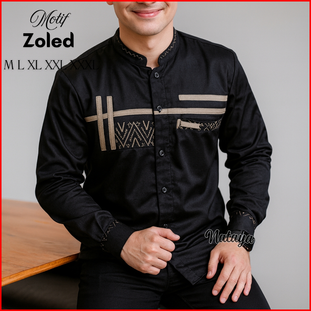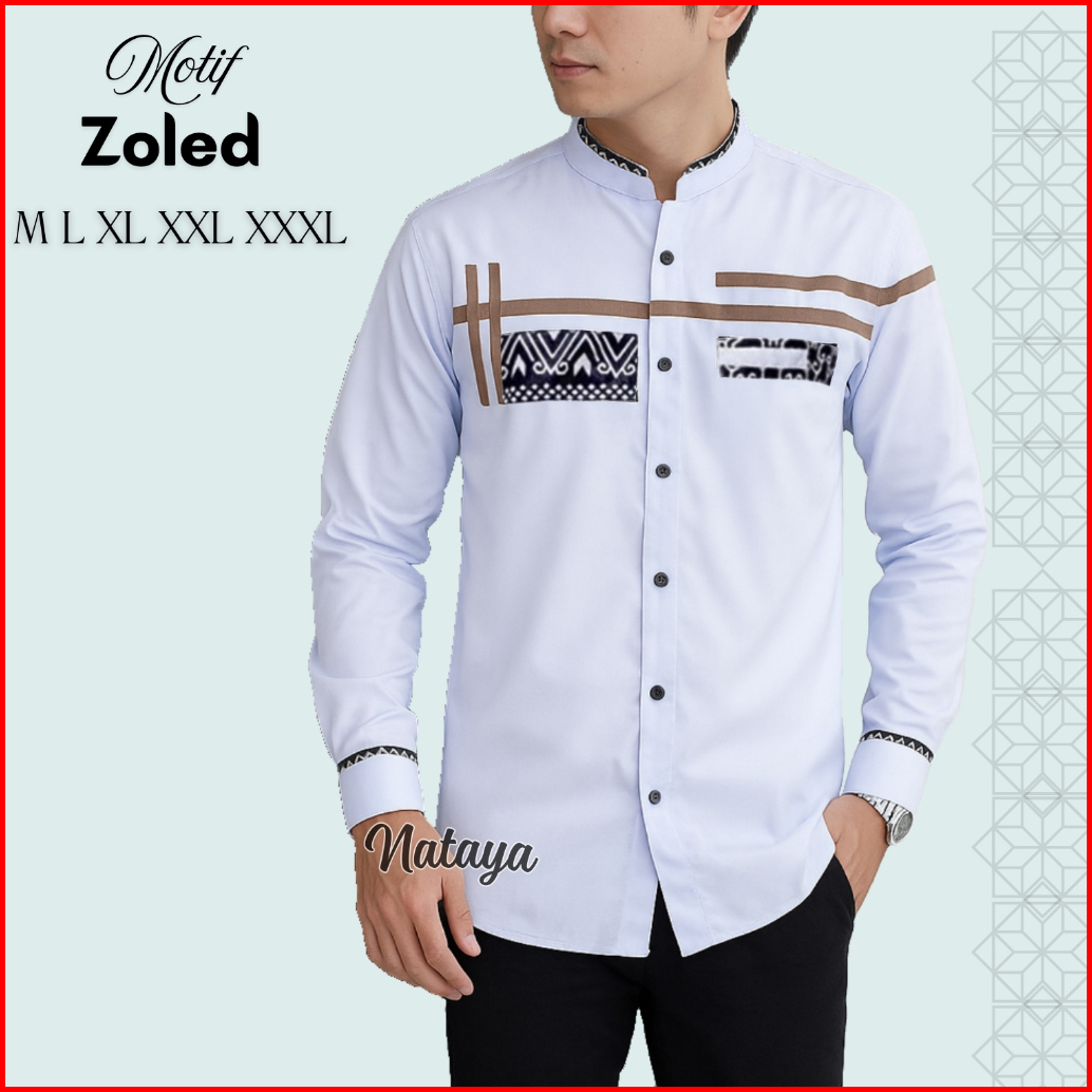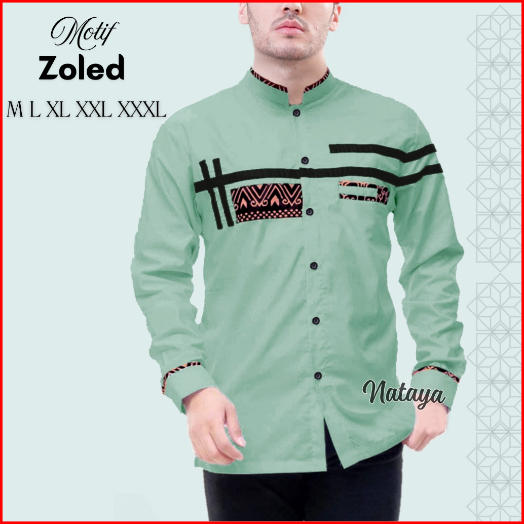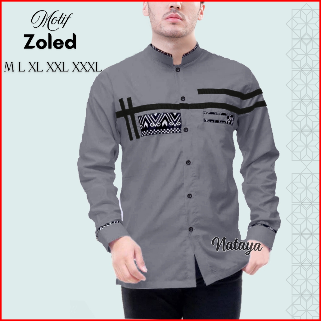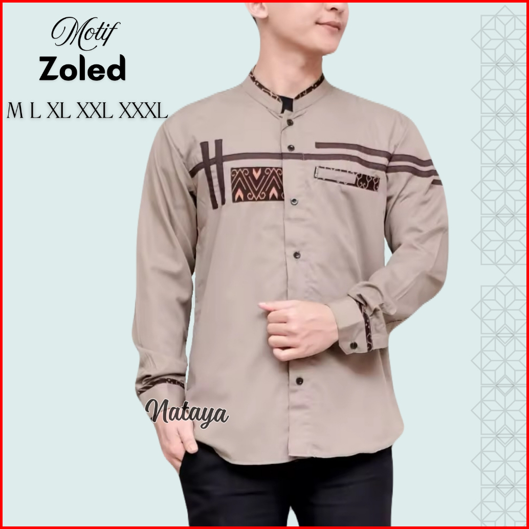Baju Koko Pria Koko Lengan Panjang Motif Zoled Kombinasi Batik Warna Putih Cokelat Sage Hitam Abu