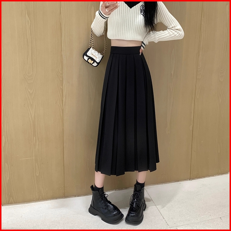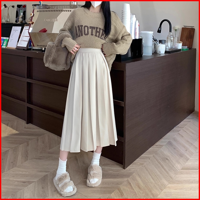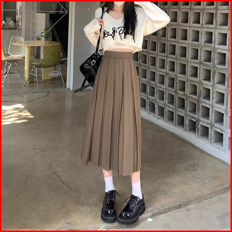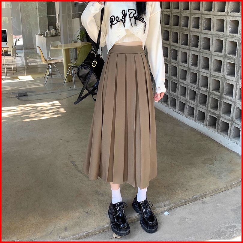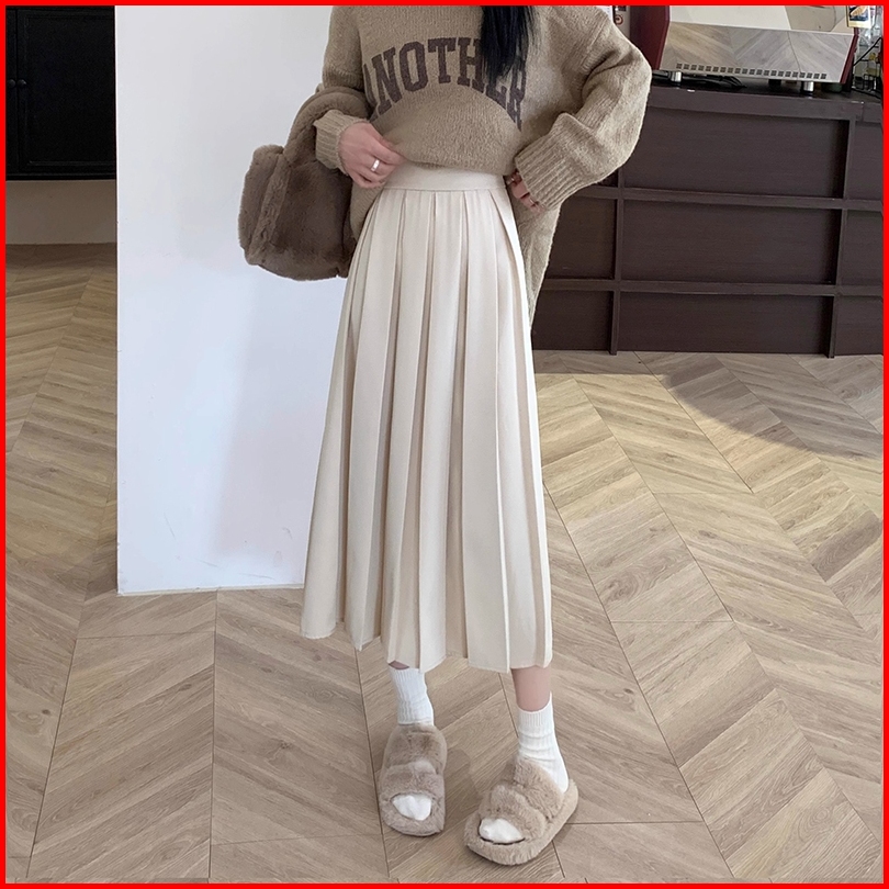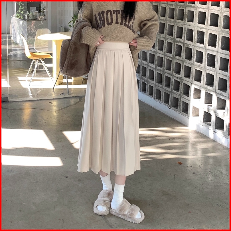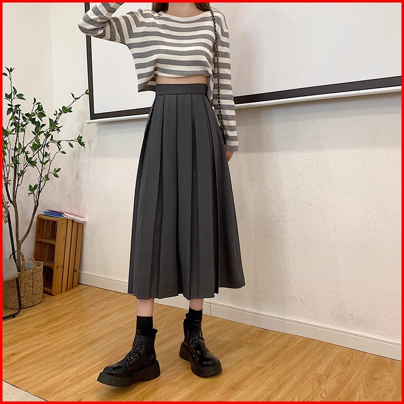 Rok Panjang Kasual Wanita Gaya Korea - Rok Lipit Lurus Longgar - Rok Midi Lipit