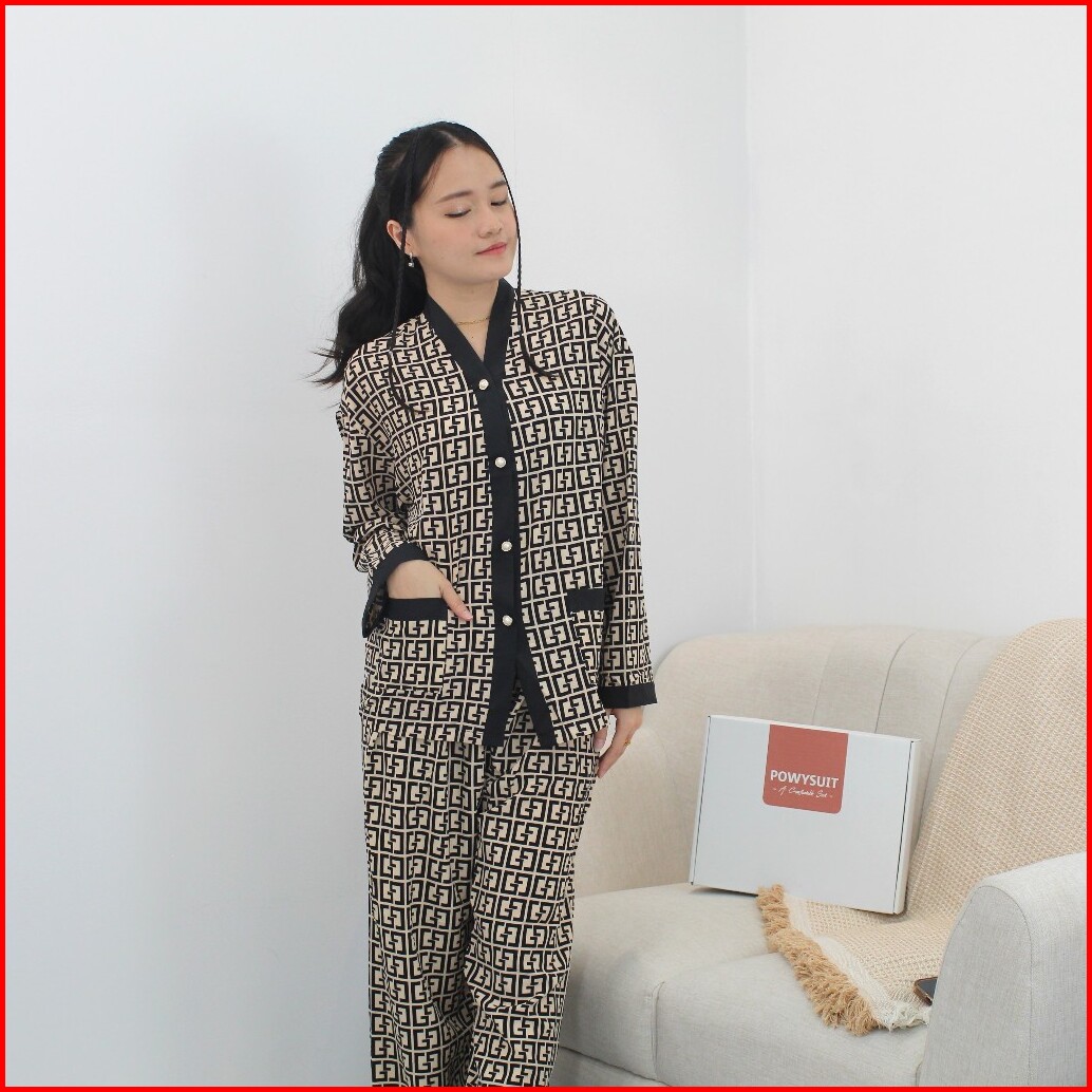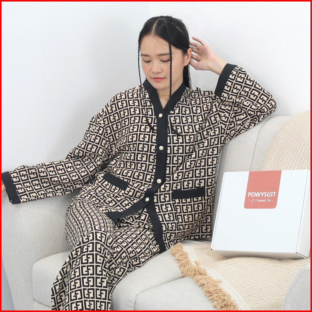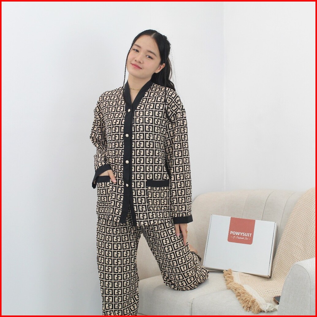 St Yx Piyama Dewasa Motif Gg Satin Sutra Setelan Kancing Powysuit Baju Tidur Wanita Lembut