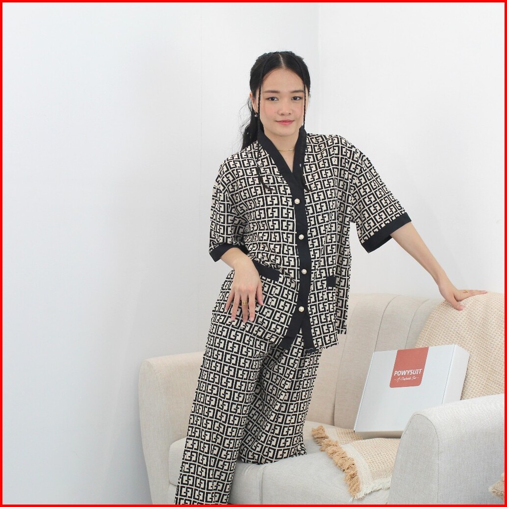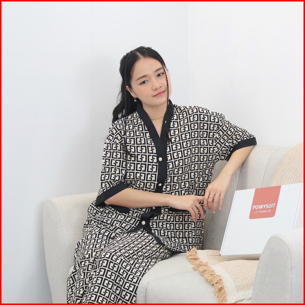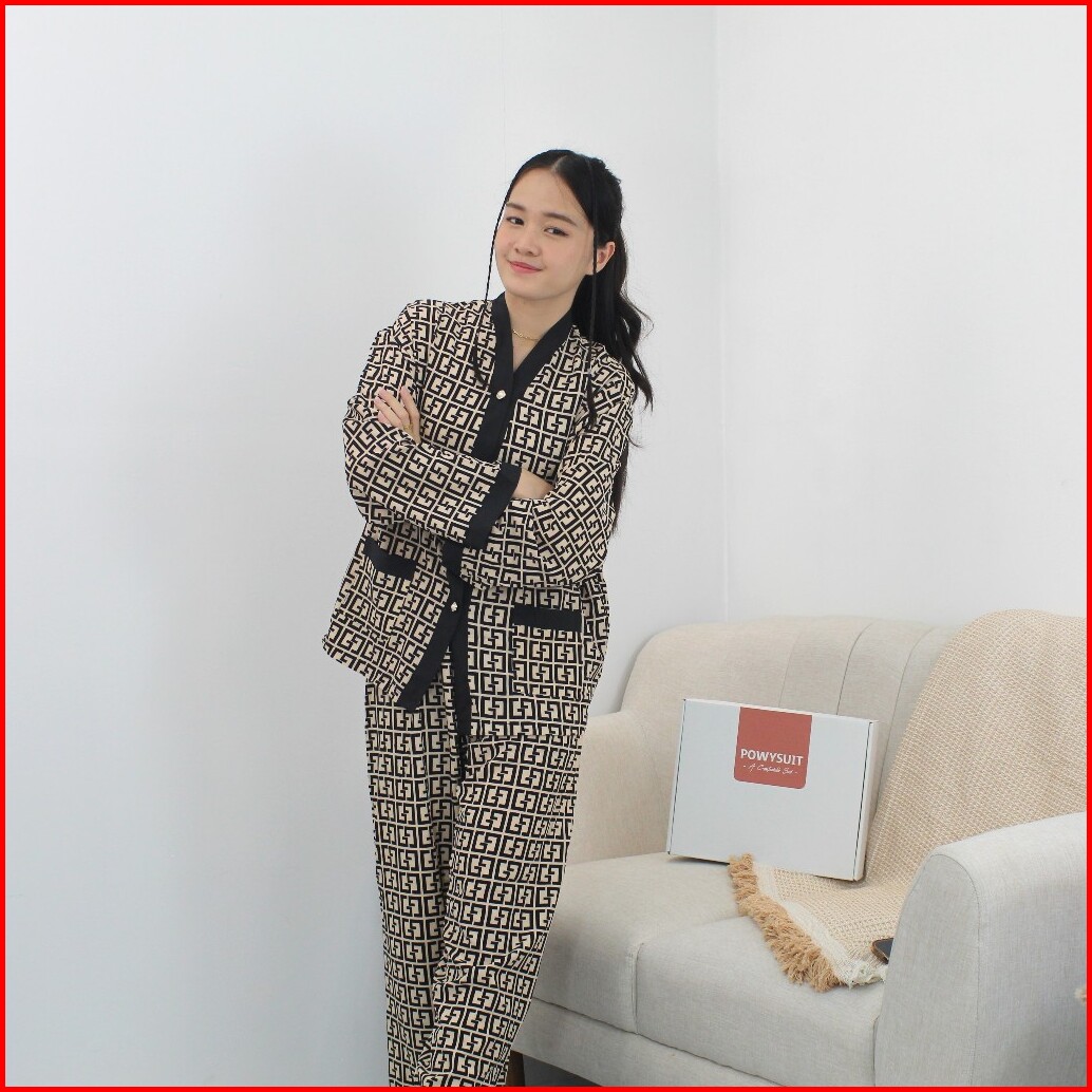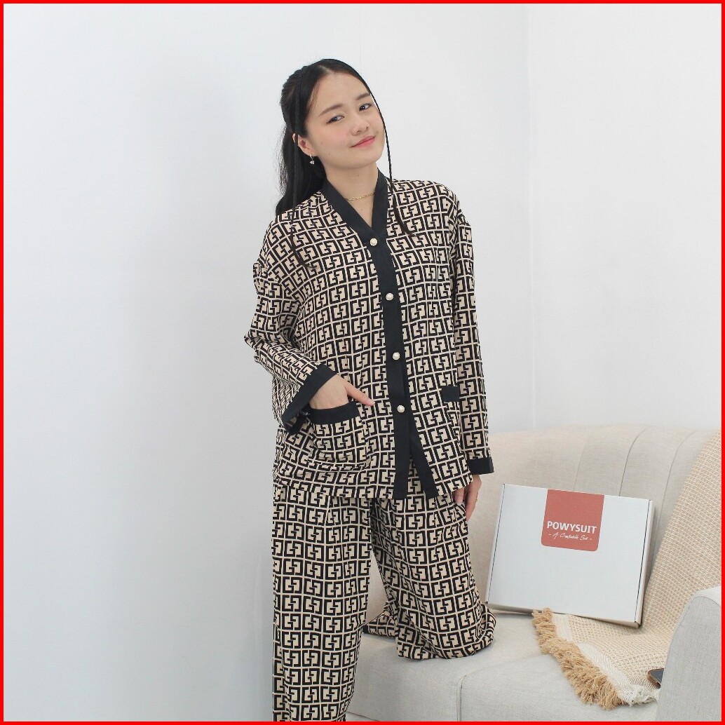 St Yx Piyama Dewasa Motif Gg Satin Sutra Setelan Kancing Powysuit Baju Tidur Wanita Lembut