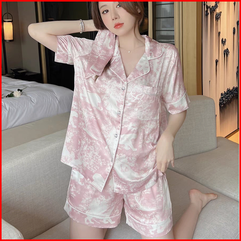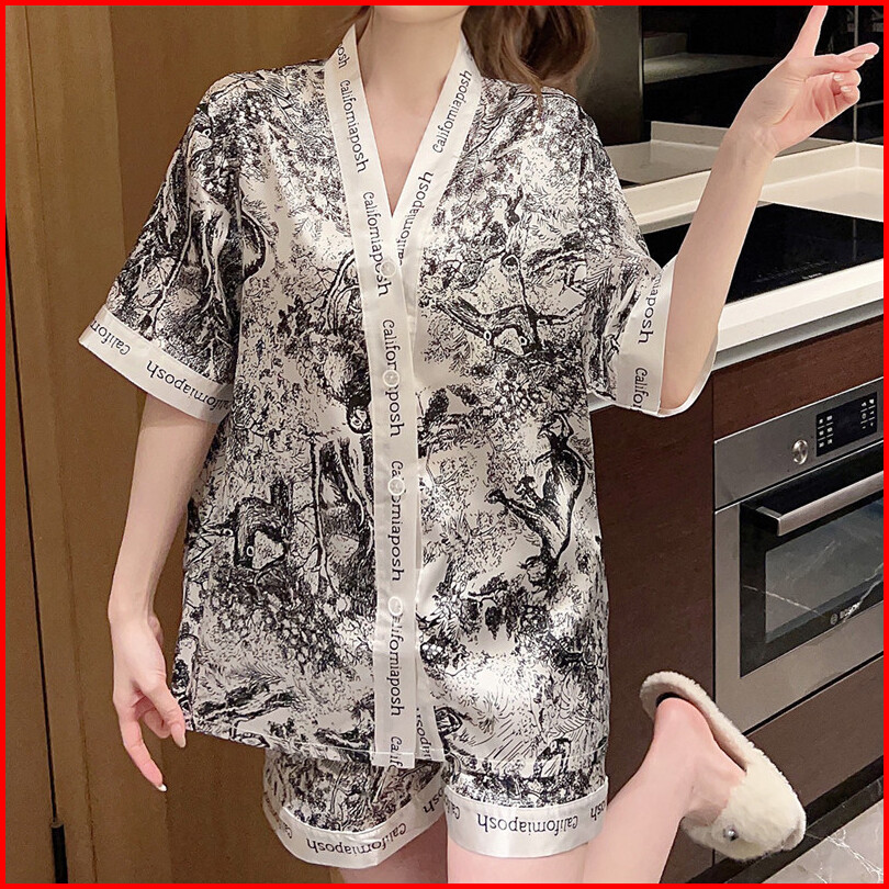 Piyama Satin Wanita Set Pakaian Tidur Lukisan Tinta Ikat Celup