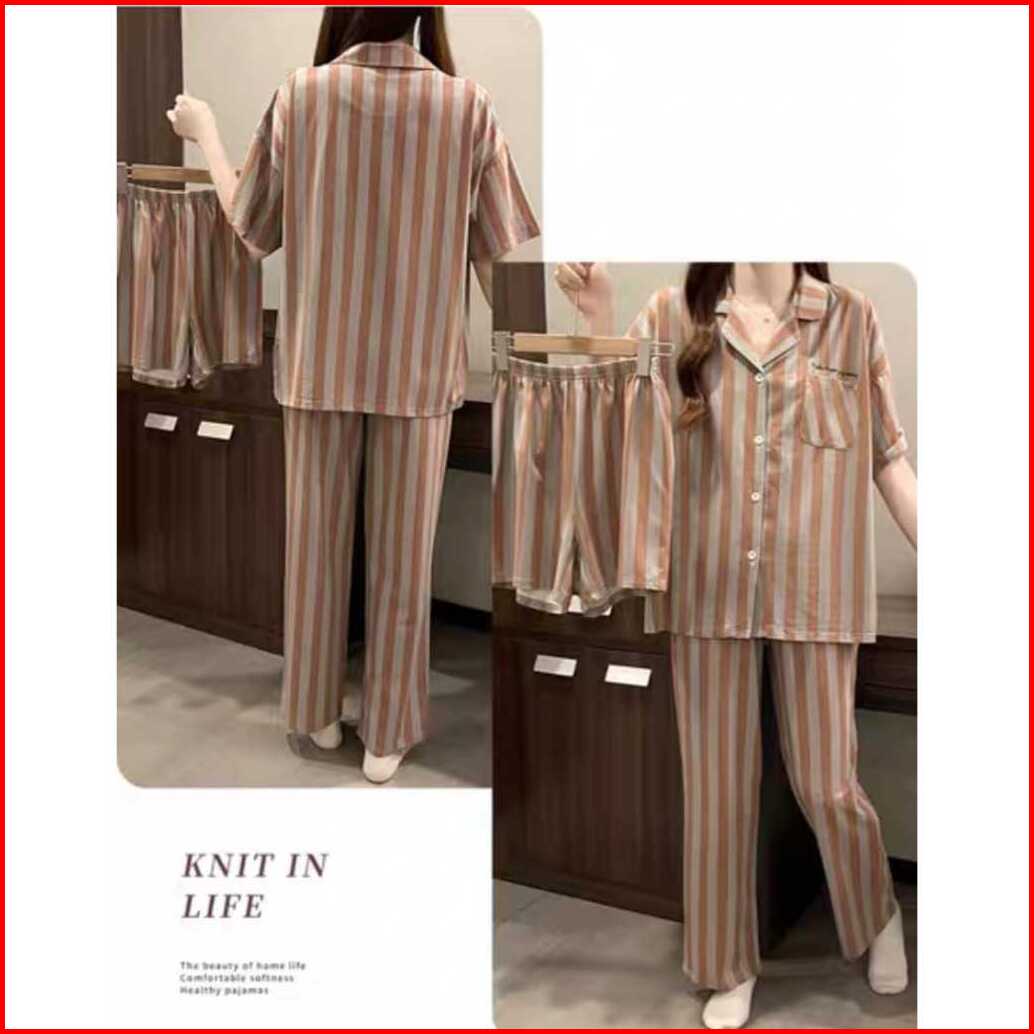Baju Tidur Piyama Lengan Pendek Celana Panjang Model Kra 3in1 Bahan Spandek Import Motif Bisa Buat Cewek Dan Cowok