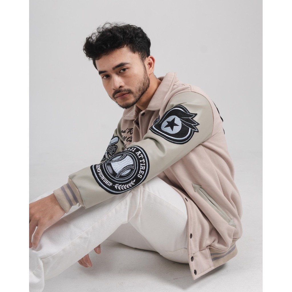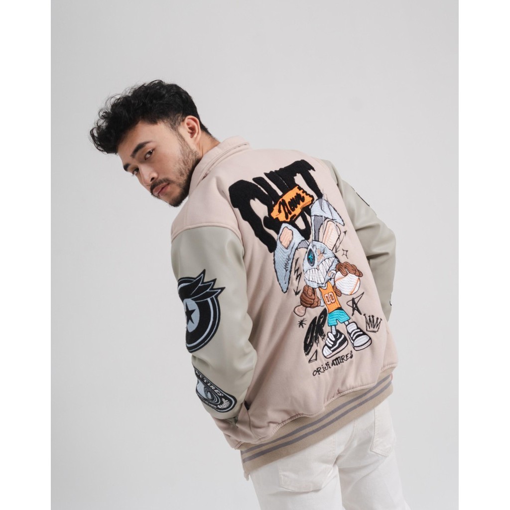 ORIJIATTIRES JAKET VARSITY PRIA WANITA NEVER QUIT FULL BORDIR FLEECE KOMBINASI KULIT KARLIT LENGAN PANJANG M L XL (ORJ-BR009VR)