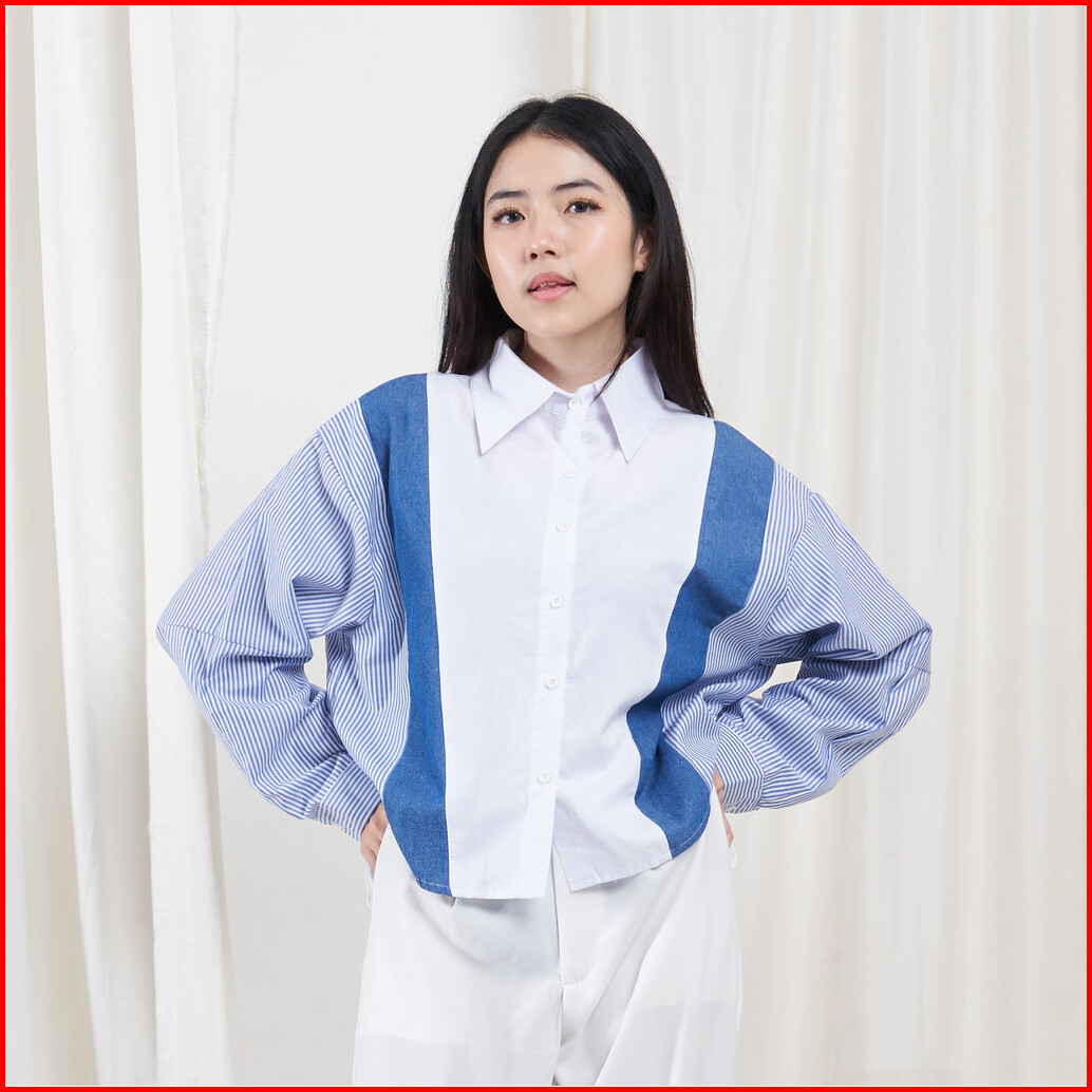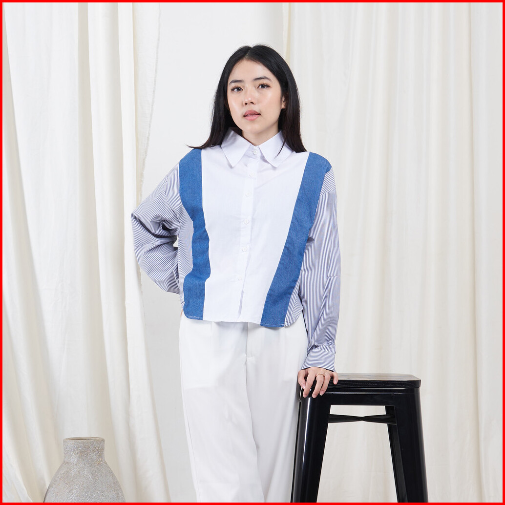 Queentin Kemeja Wanita Kombinasi 0748 Katun Twill Denim Chambray Polymicro Salur Lengan Panjang
