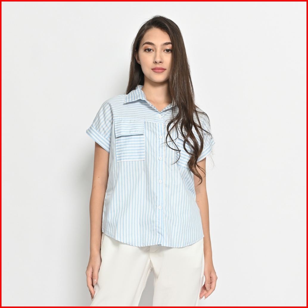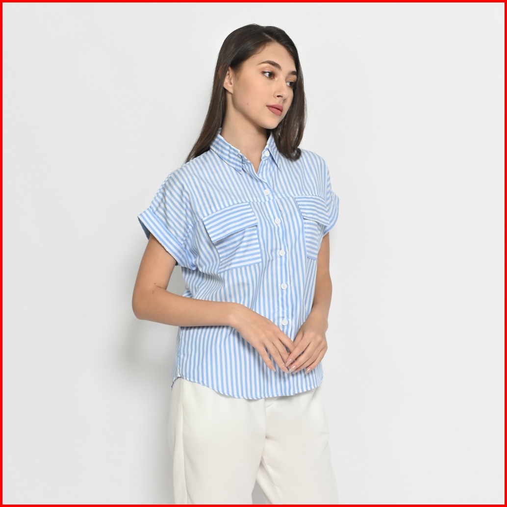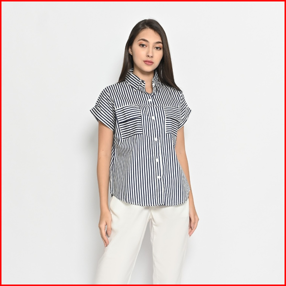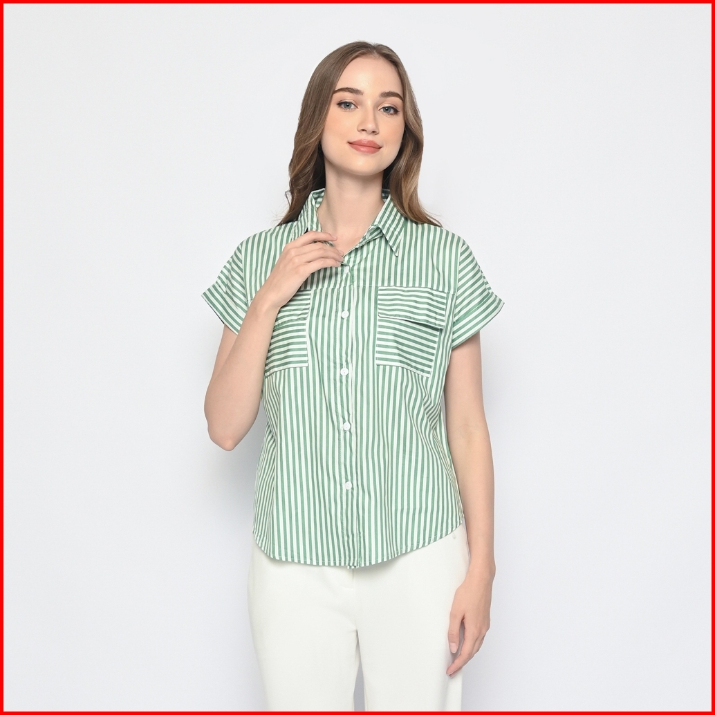 Queentin Kemeja Wanita Casual 0110 Katun Woven Motif Salur Lengan Pendek