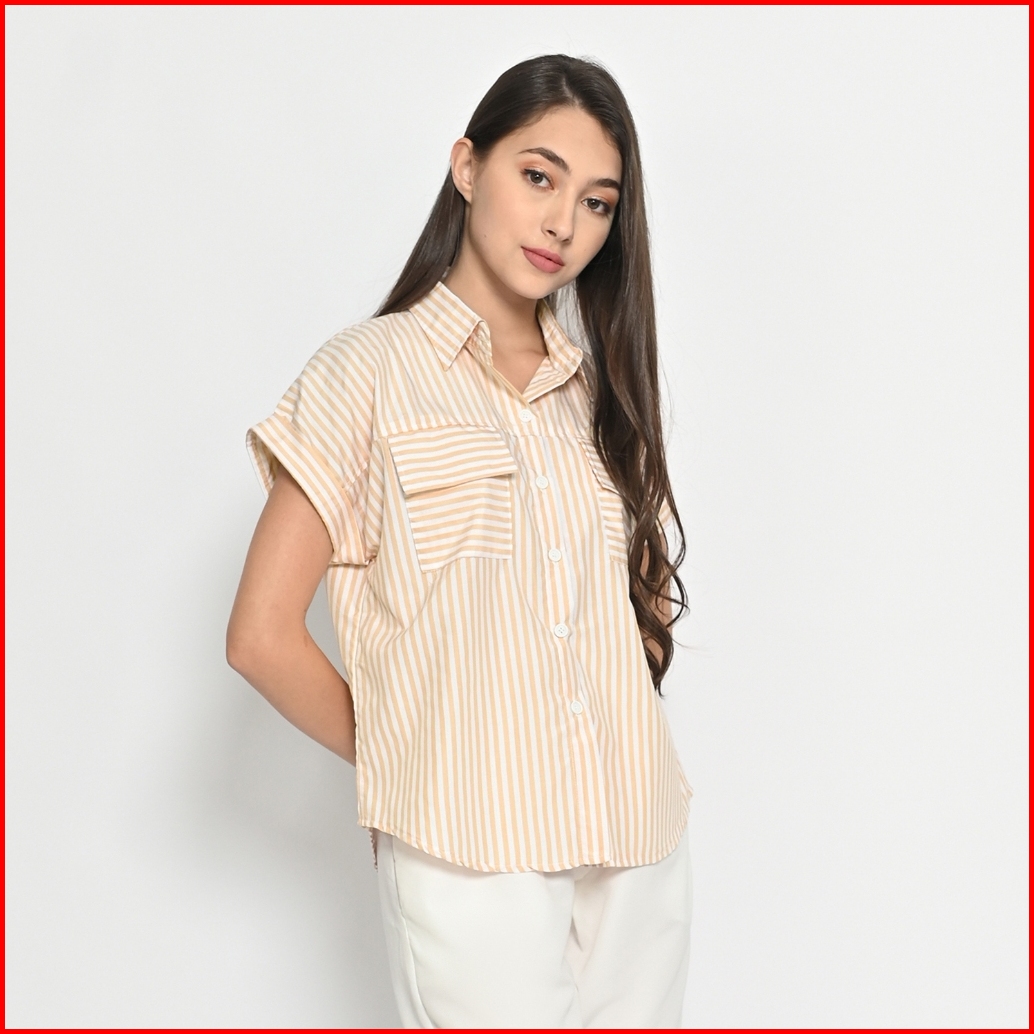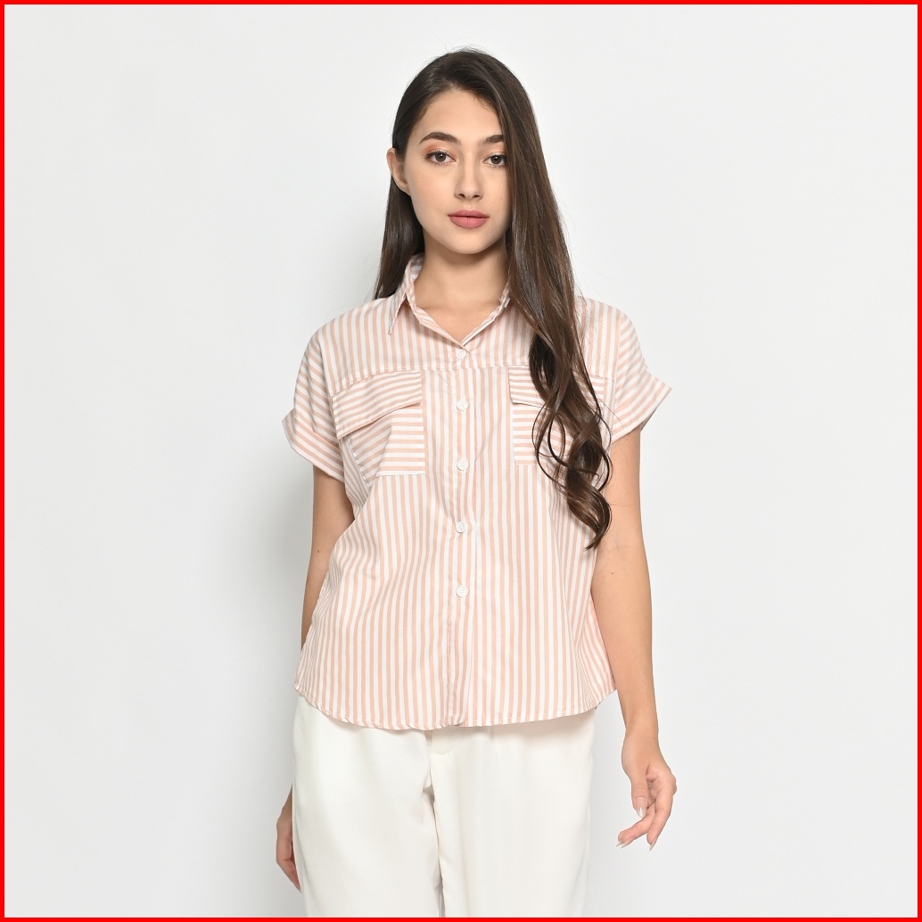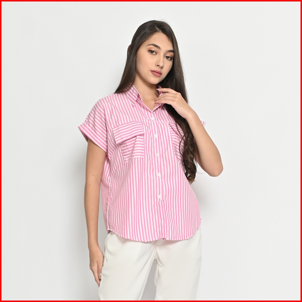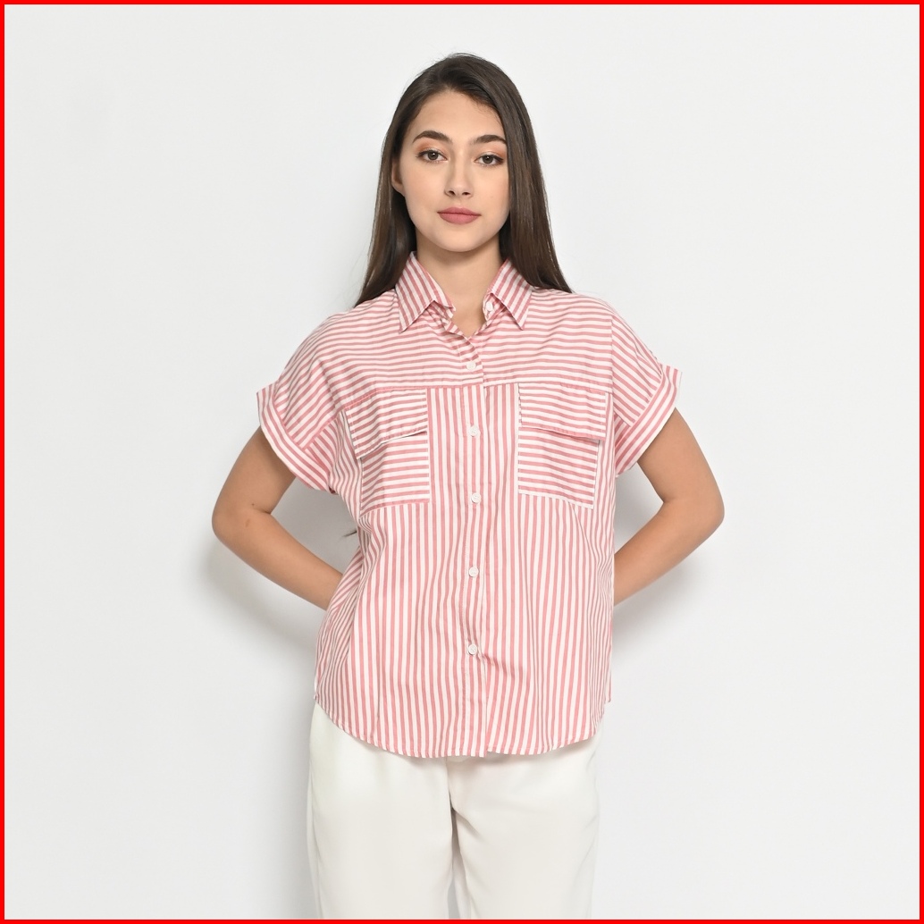 Queentin Kemeja Wanita Casual 0110 Katun Woven Motif Salur Lengan Pendek