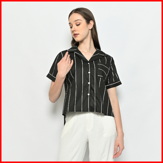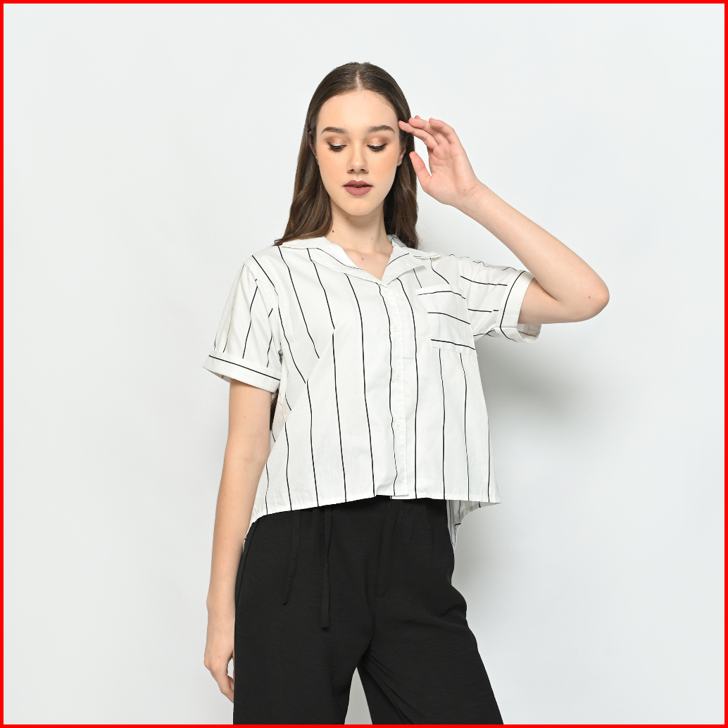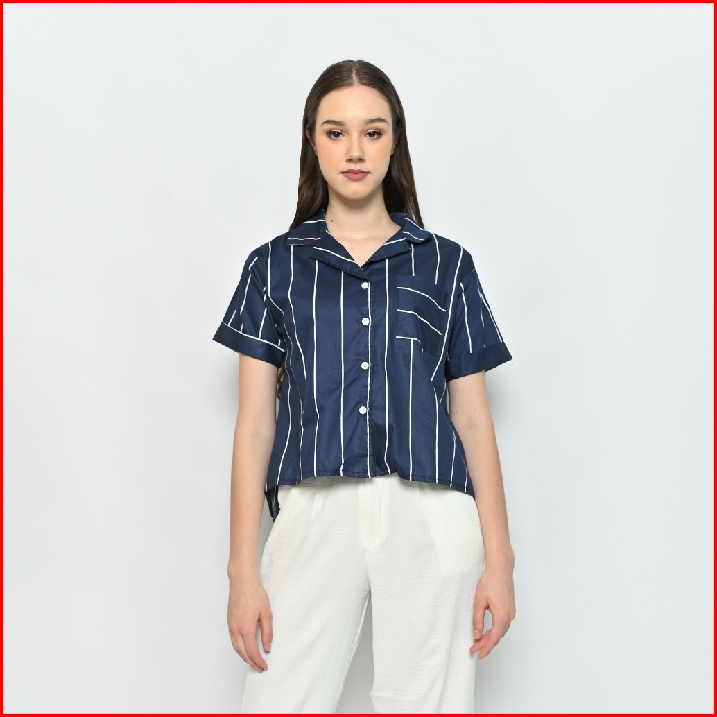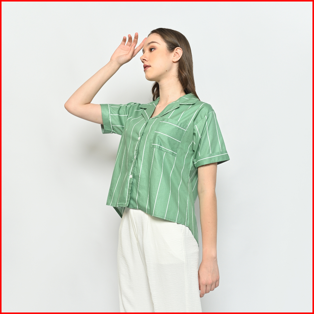Queentin Kemeja Crop Casual Wanita 0171 Katun Turkey Salur Lengan Pendek