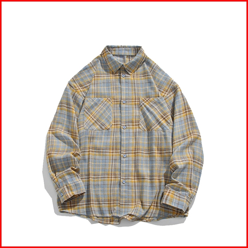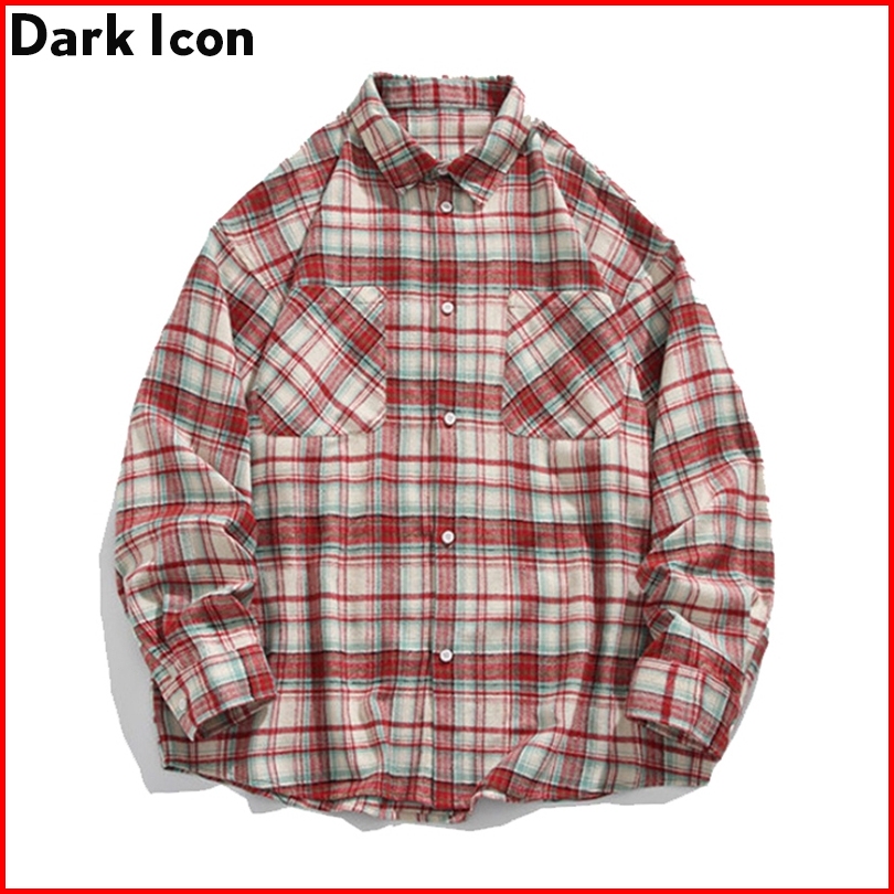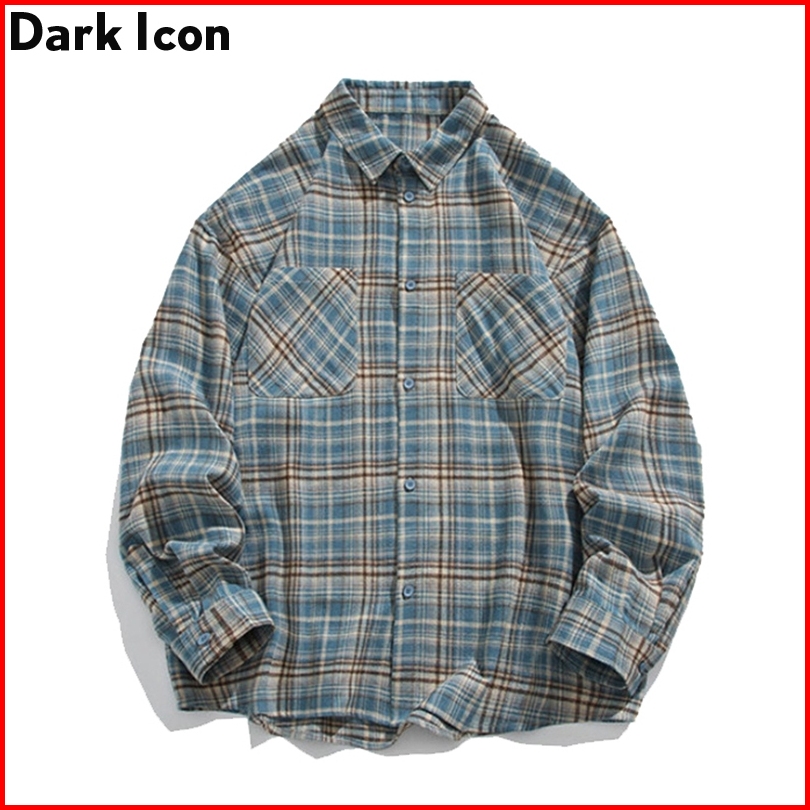 Dark Icon Kemeja Flanel Pria Wanita Kotak-kotak Klasik Santai Katun Kemeja Cowok Siswa Pakaian