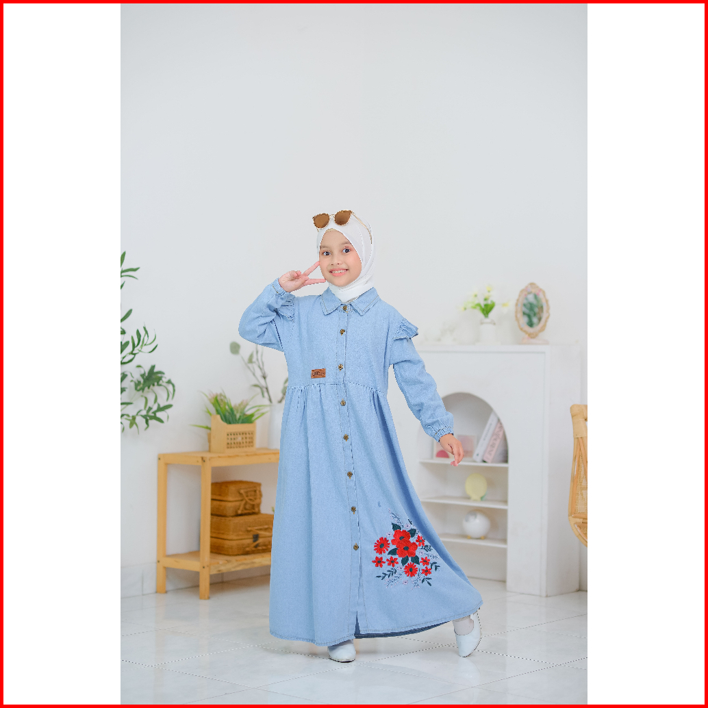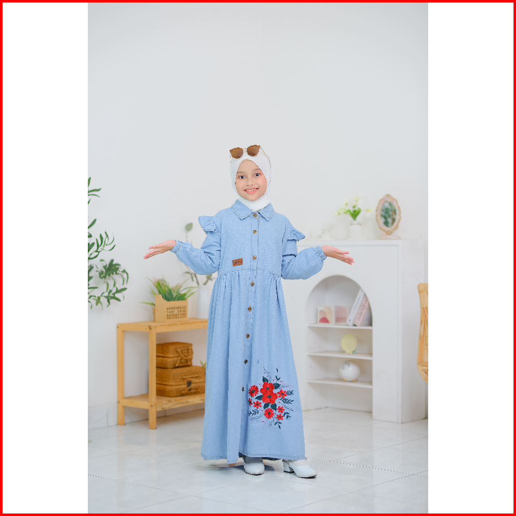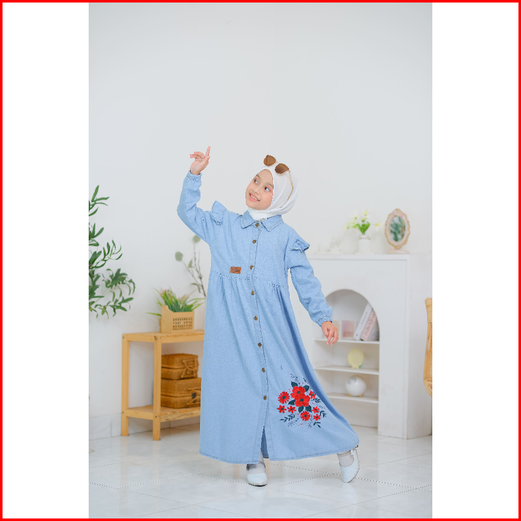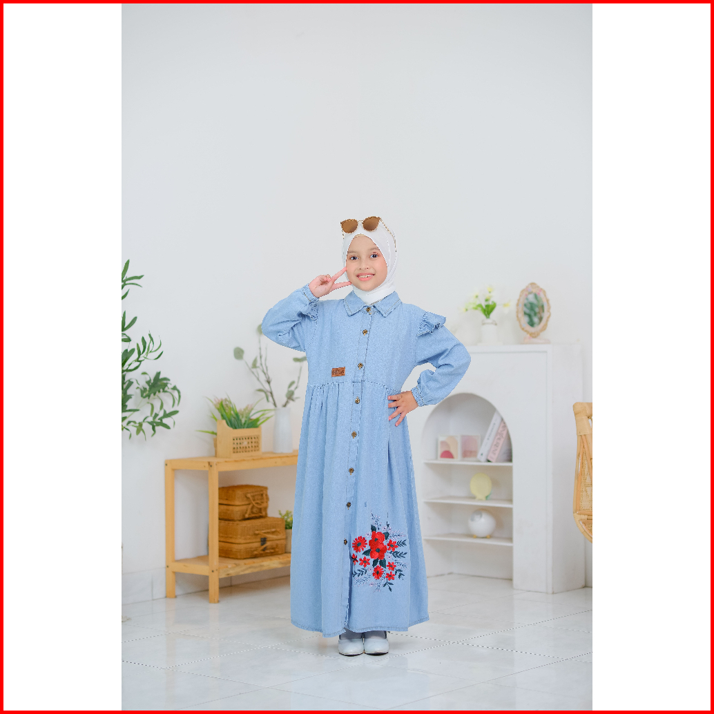 Gamis Denim Jeans Bordir Anak Perempuan Usia 4 Sampai 12 Tahun