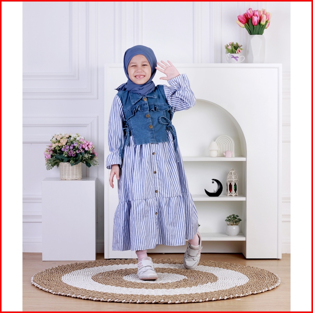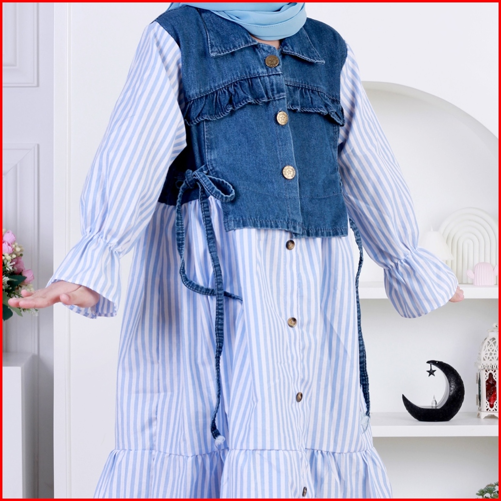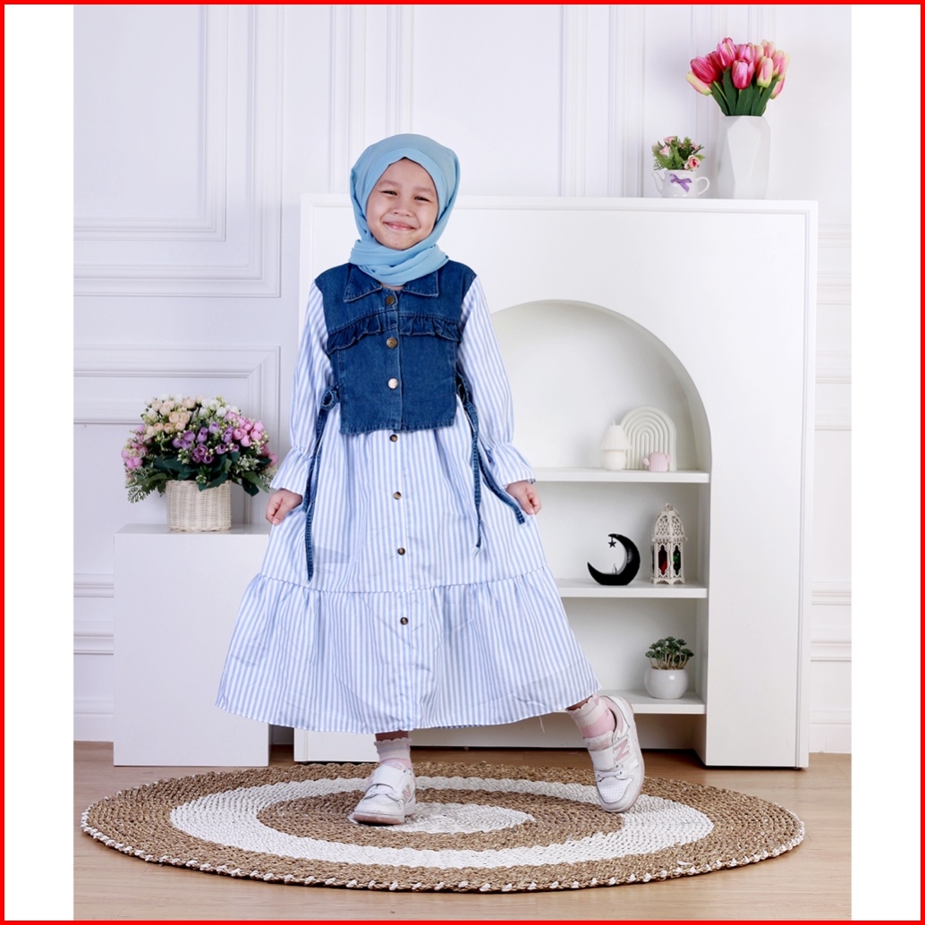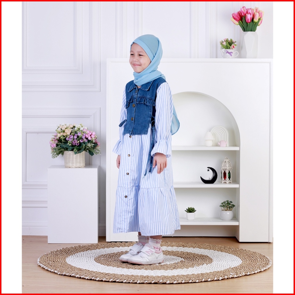 Dungdungkids Gamis Anak Nanda Rompi Jeans Katun Salur Free Pashmina Tali 3 - 11 Tahun