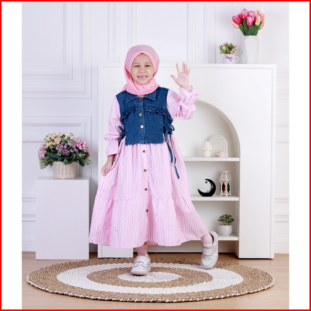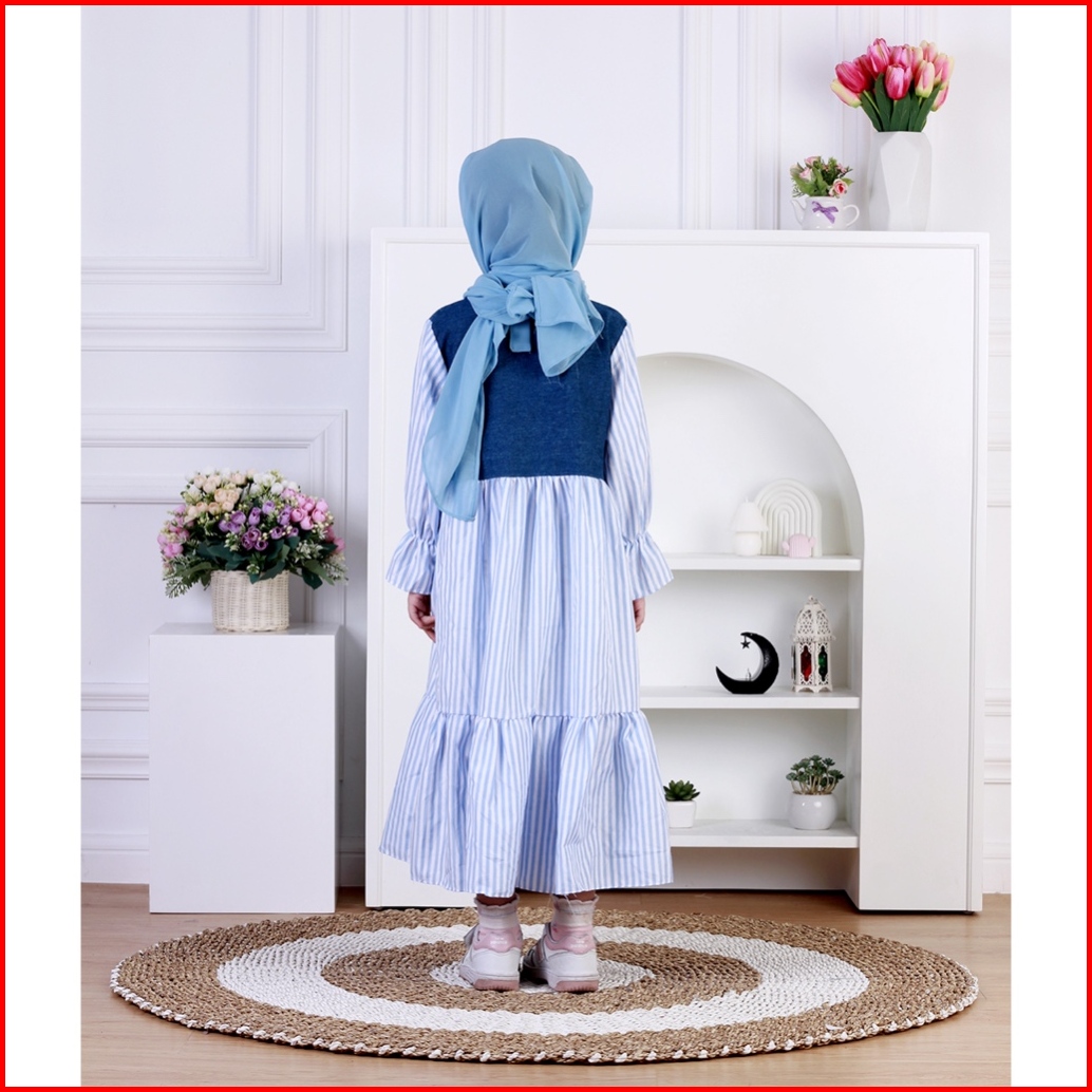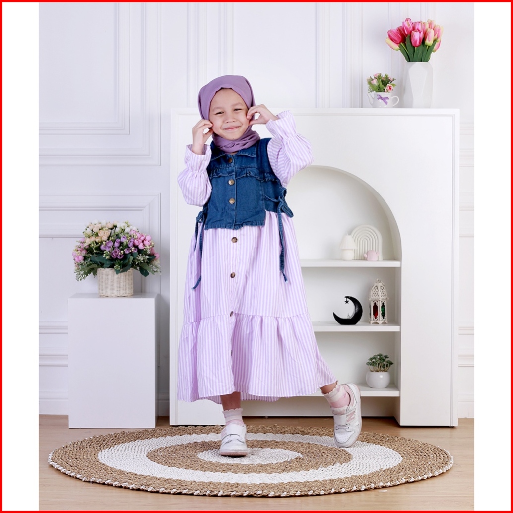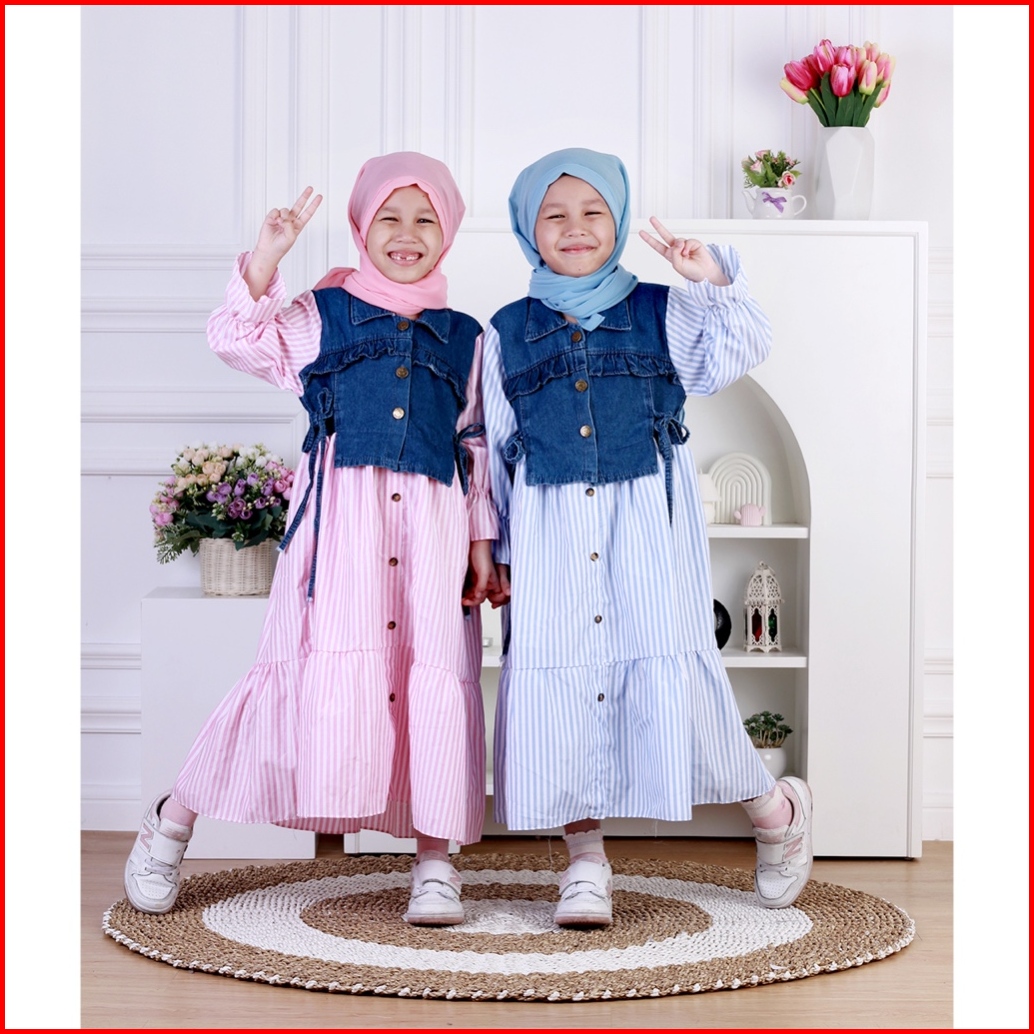 Dungdungkids Gamis Anak Nanda Rompi Jeans Katun Salur Free Pashmina Tali 3 - 11 Tahun