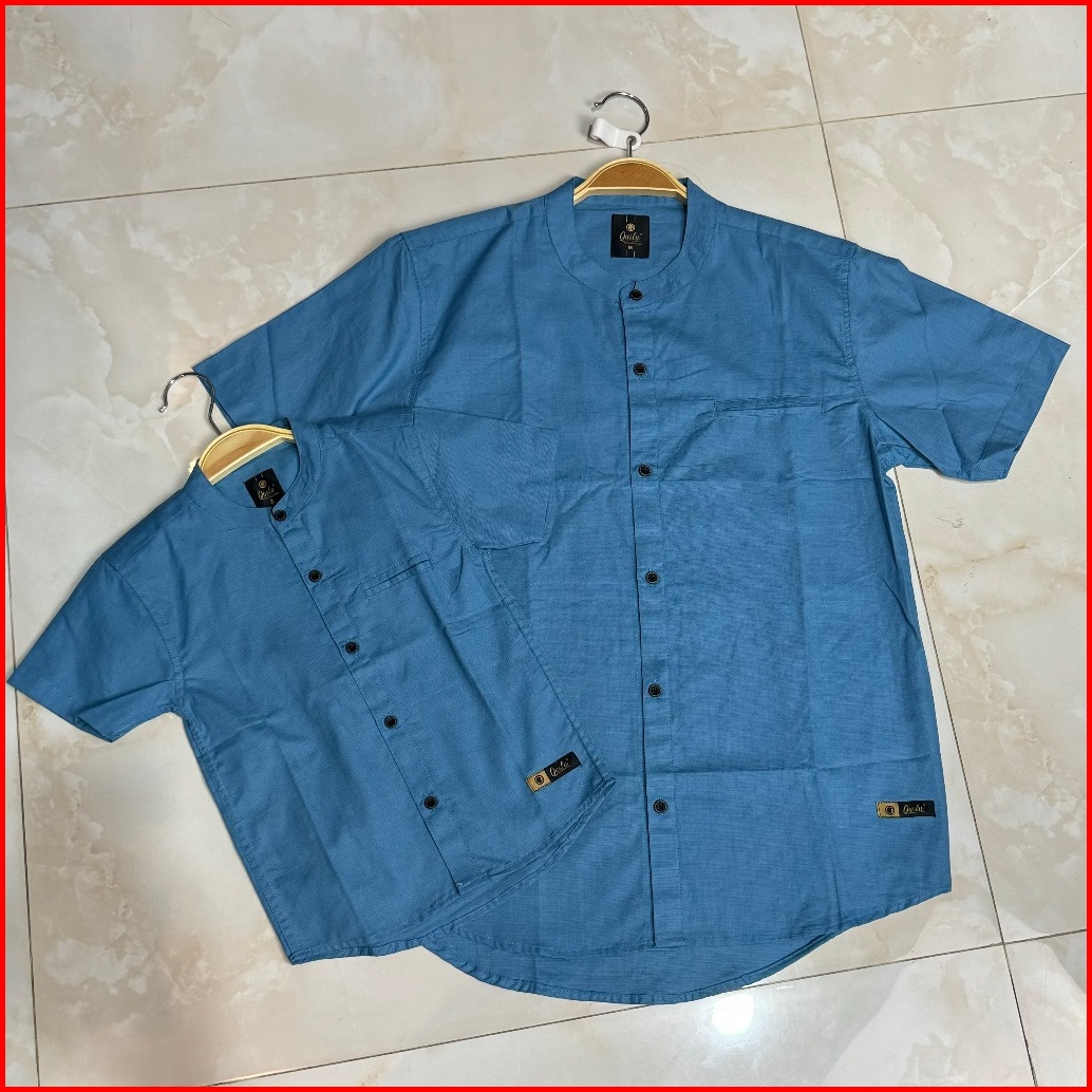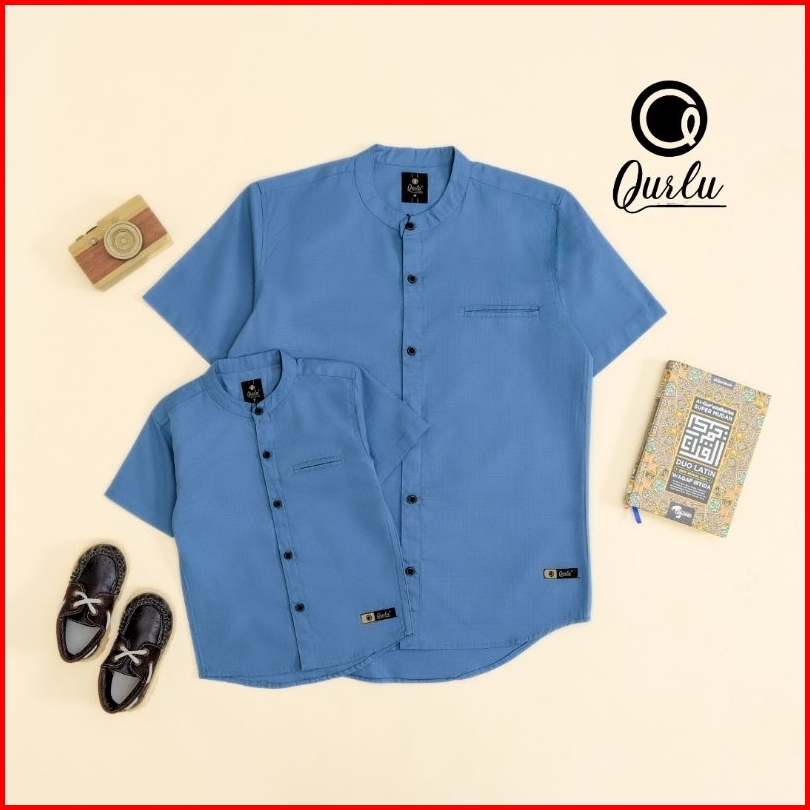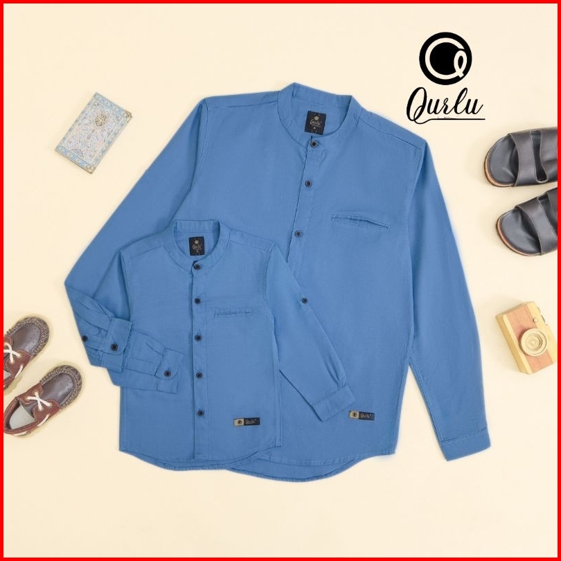 Qurlu - Kemeja Koko Dewasa Anak Warna Blue Steel Baju Couple Ayah Dan Anak Laki-laki Baju Koko Pria