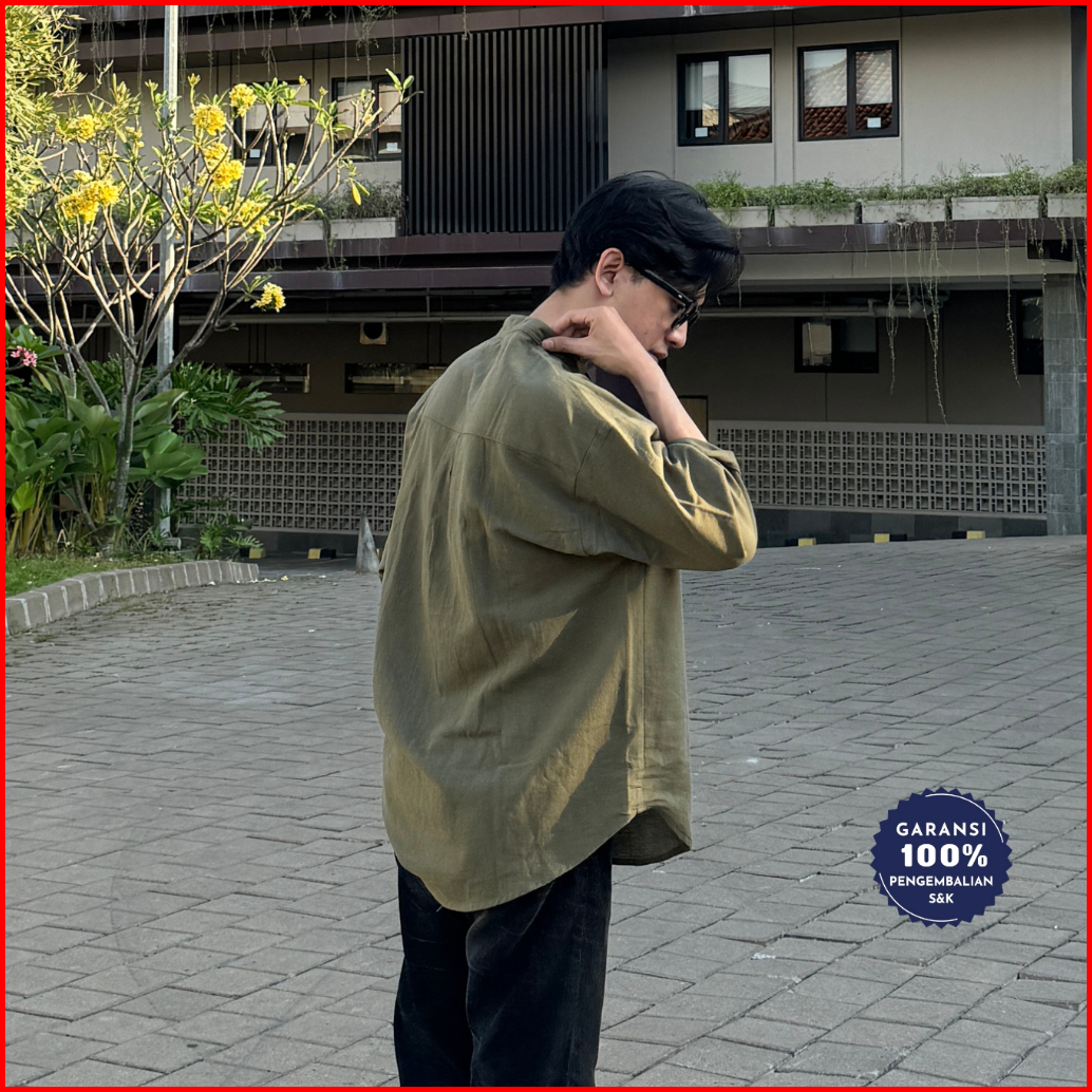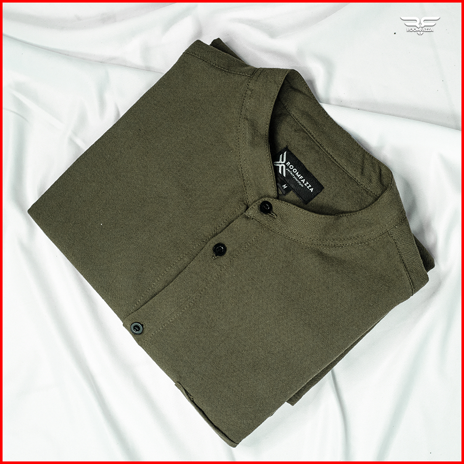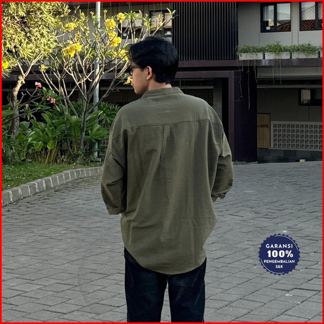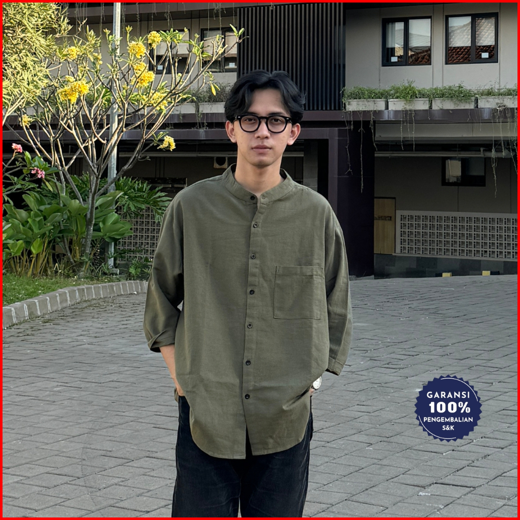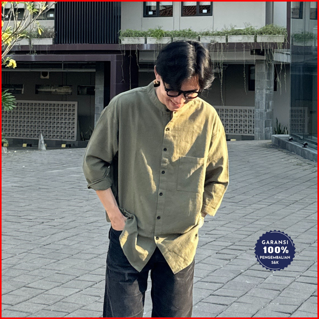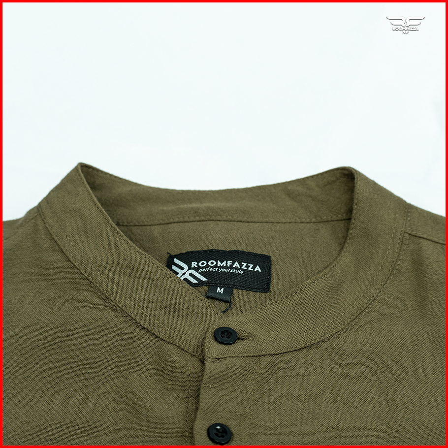 Roomfazza Kemeja Oversize Pria Linen Band Collar Polos Army