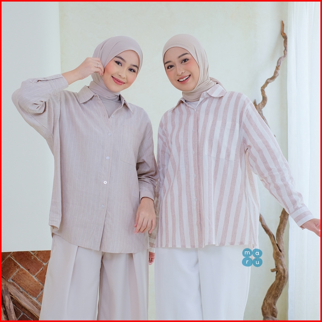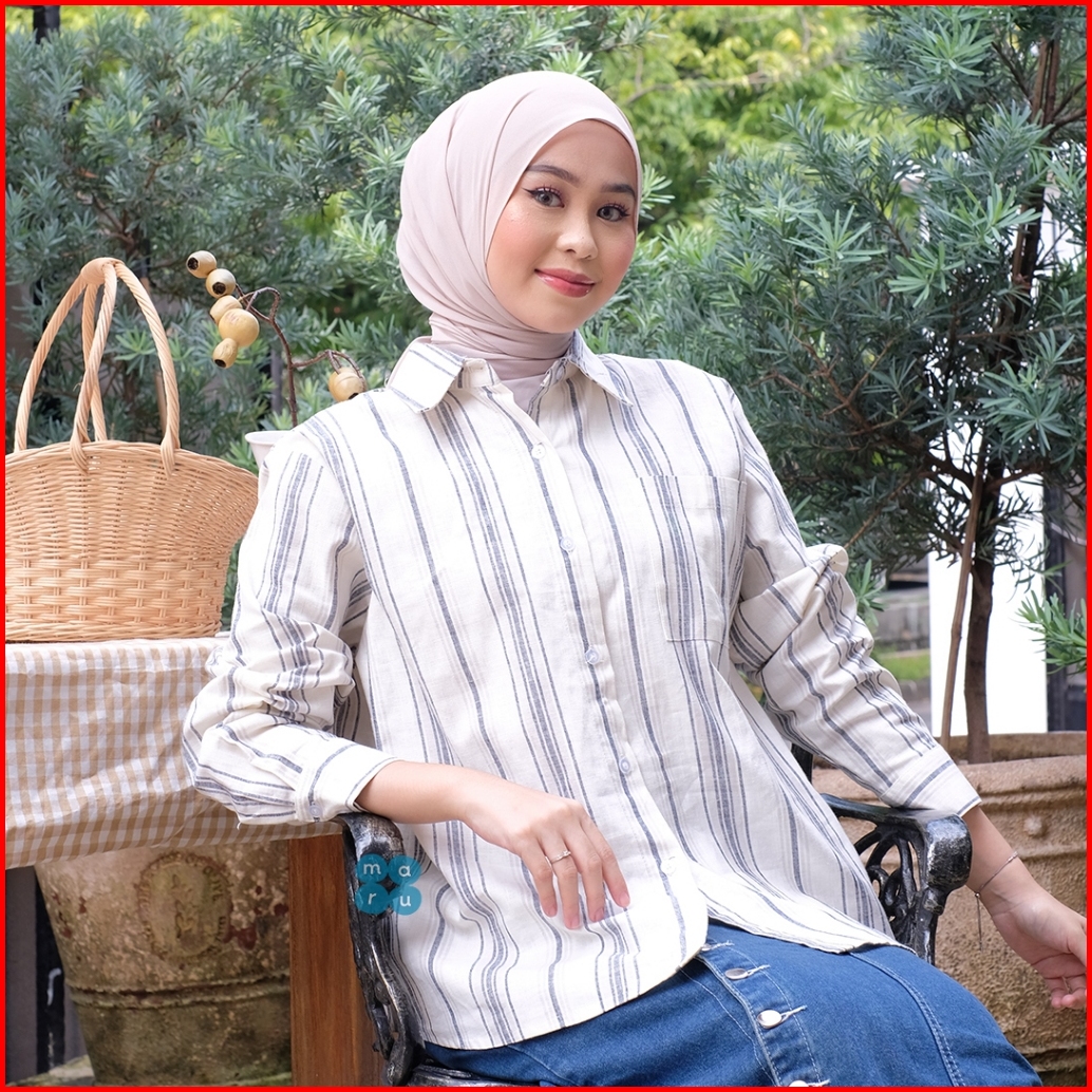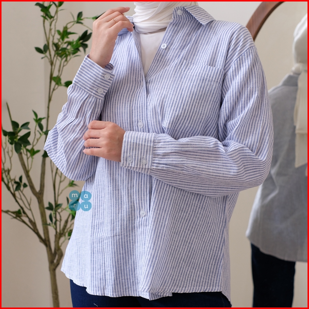 Dami Linen Stripes Shirt Kemeja Wanita Salur Linen Shirt Pakaian Kerja Atasan Formal Garis Cewek