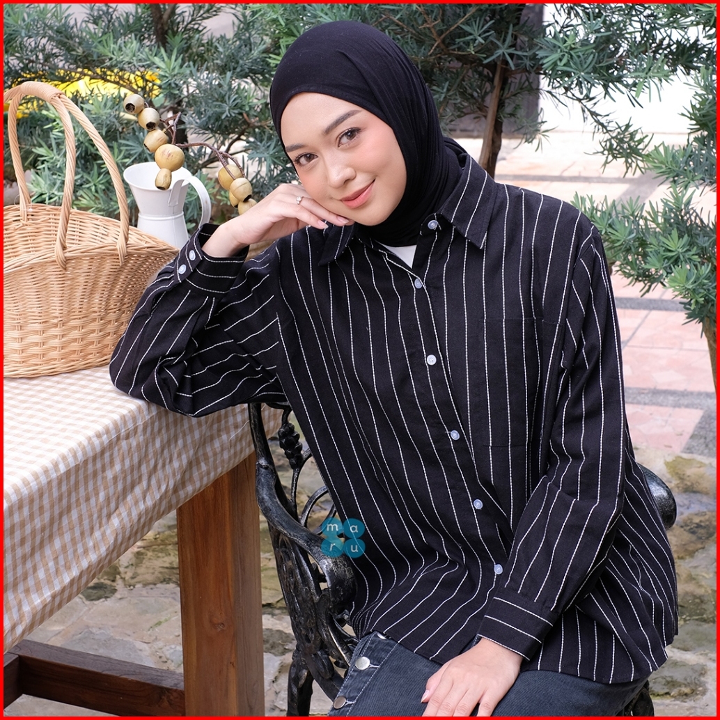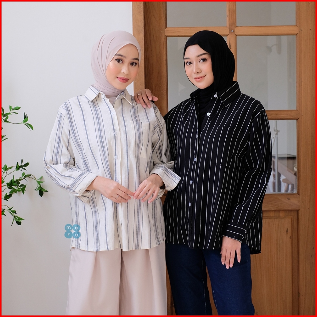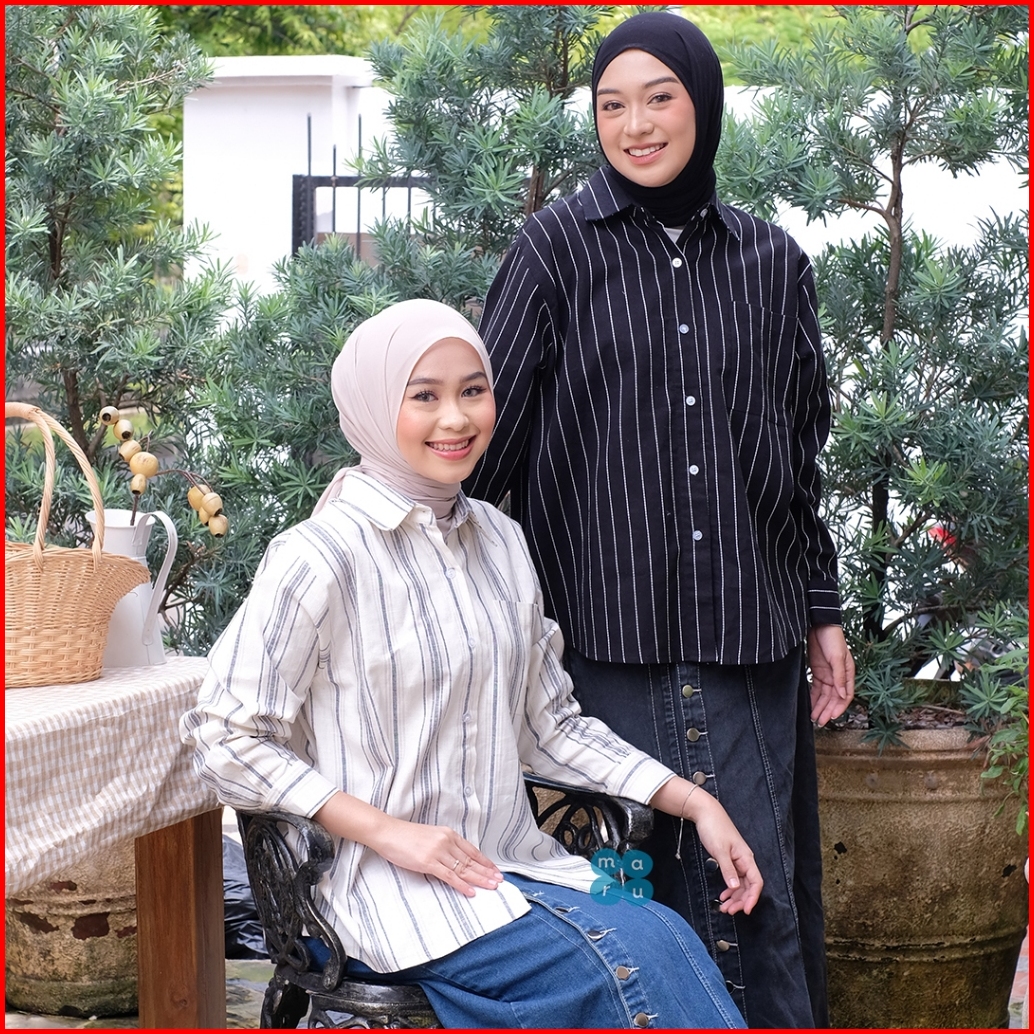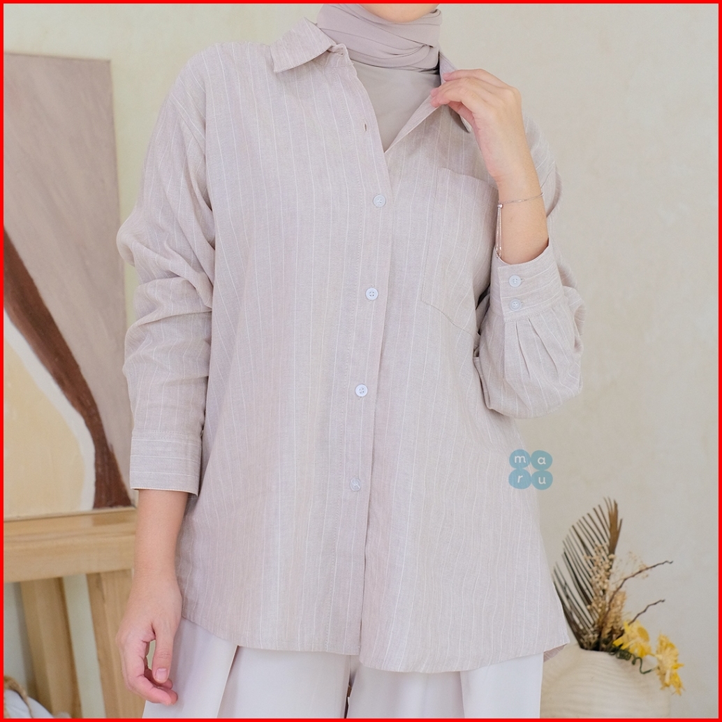 Dami Linen Stripes Shirt Kemeja Wanita Salur Linen Shirt Pakaian Kerja Atasan Formal Garis Cewek