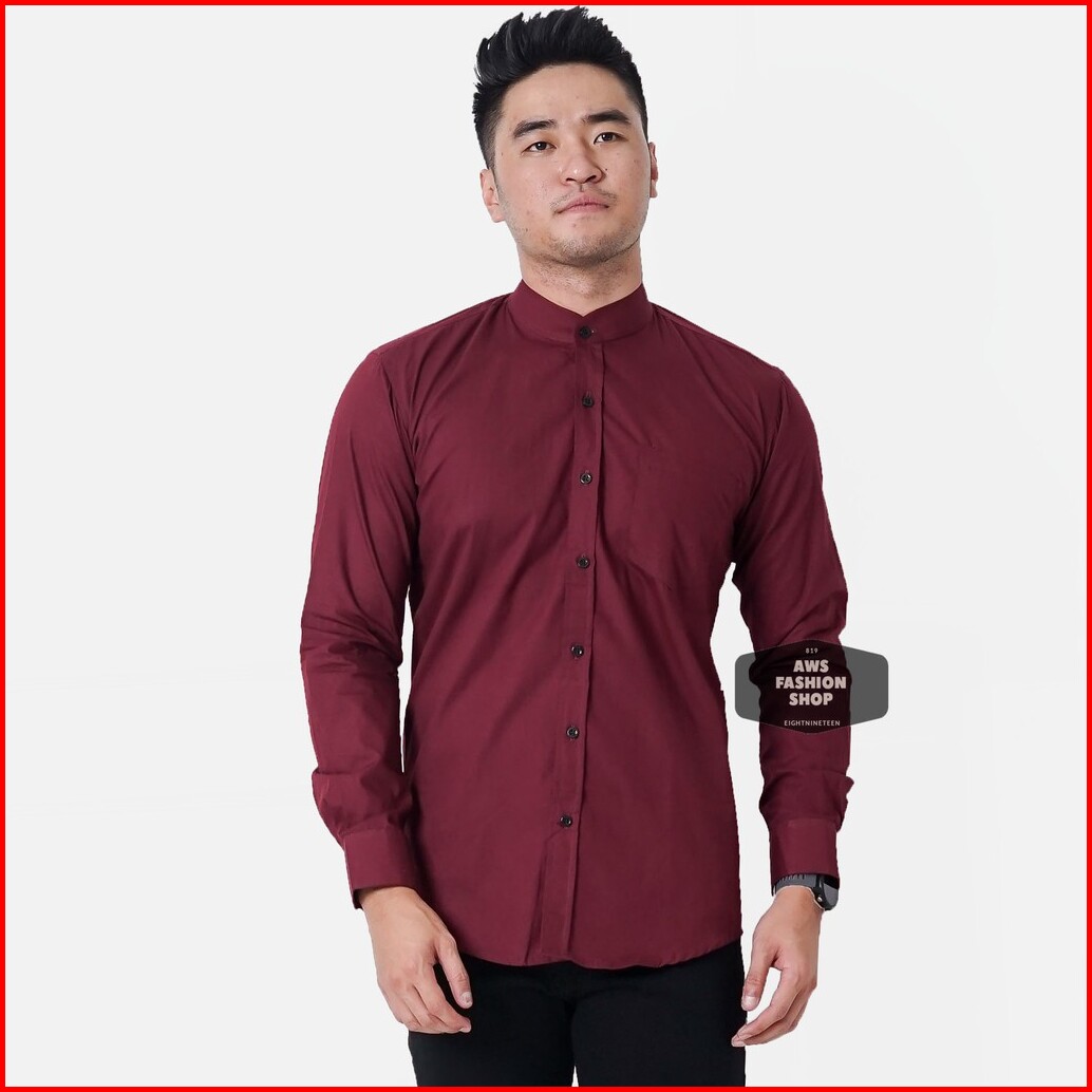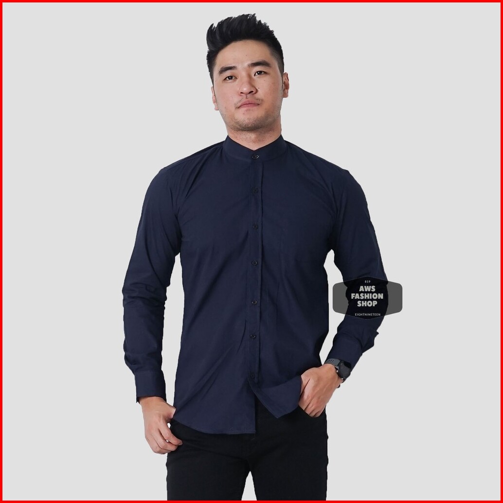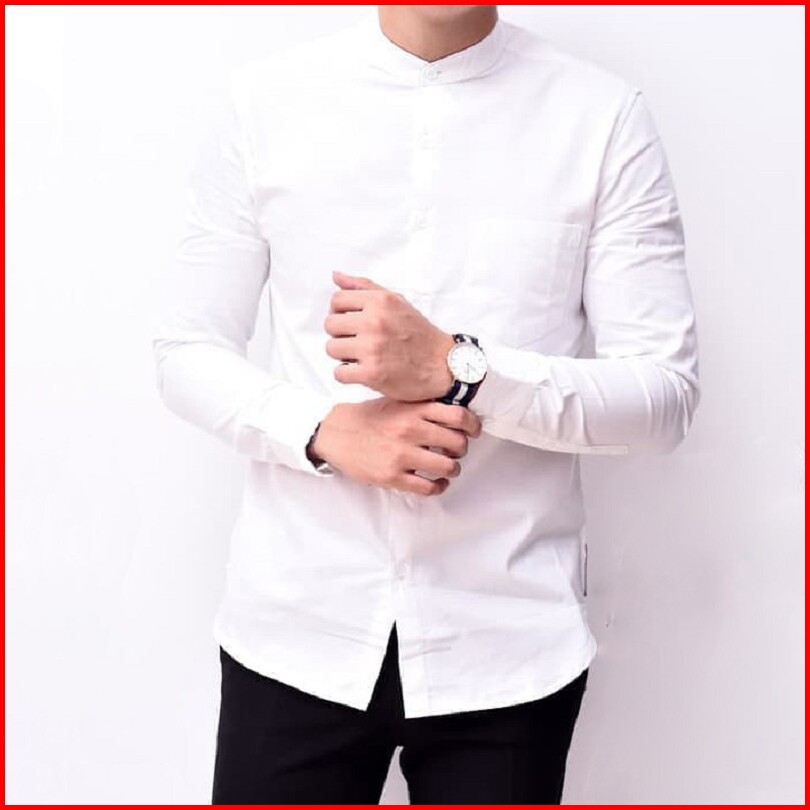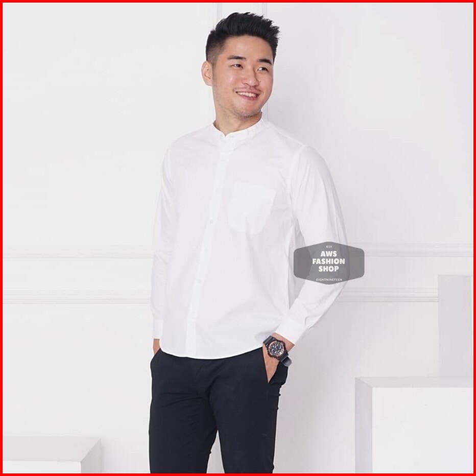 Kemeja Putih Polos Pria Lengan Panjang Kerah Shanghai Kancing 1 White Casual Slimfit 3345