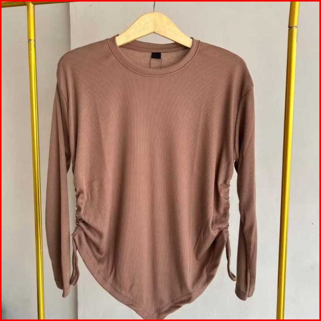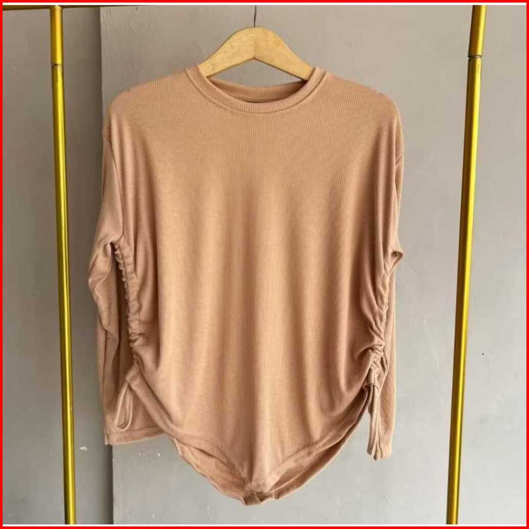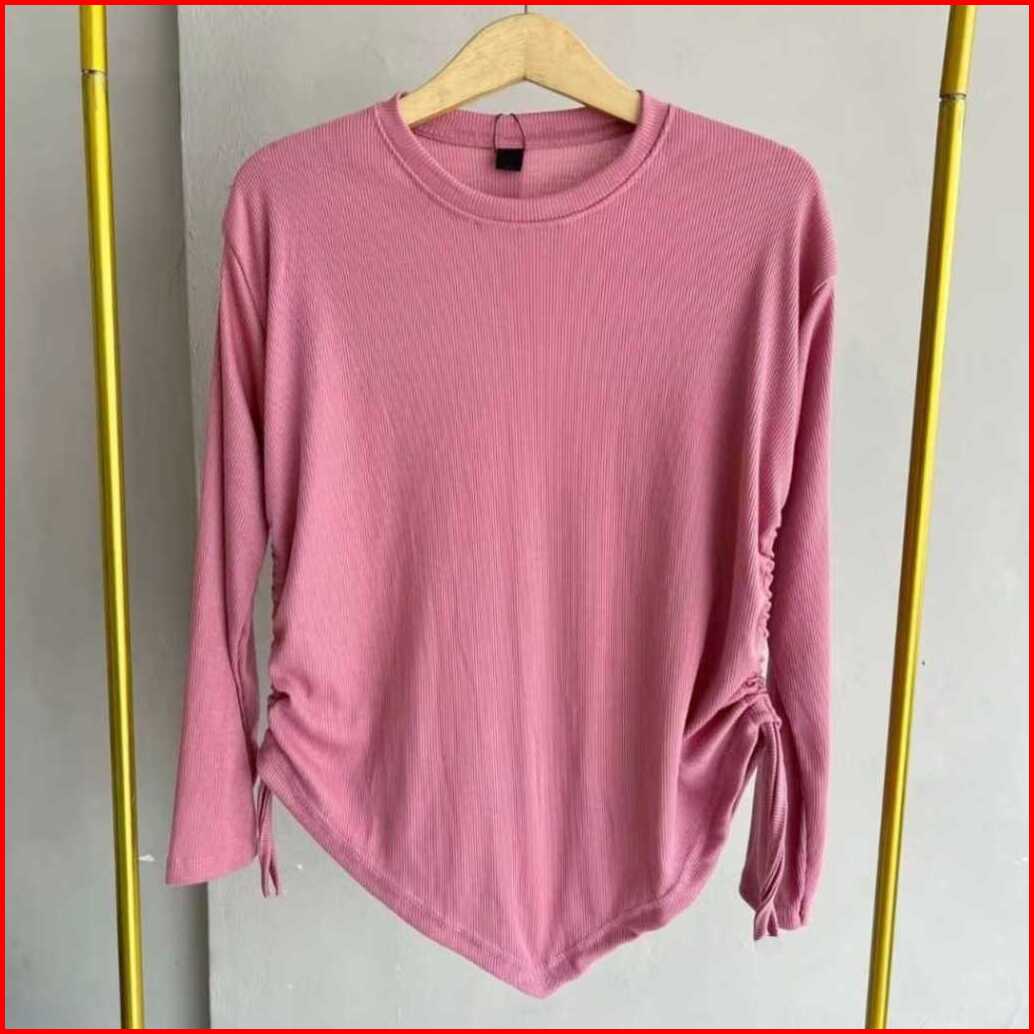 Top Blouse Jumbo Serut Samping Kiri Kanan Atasan Knit Tali Serut Lengan Panjang Model Korea