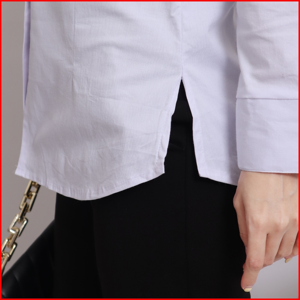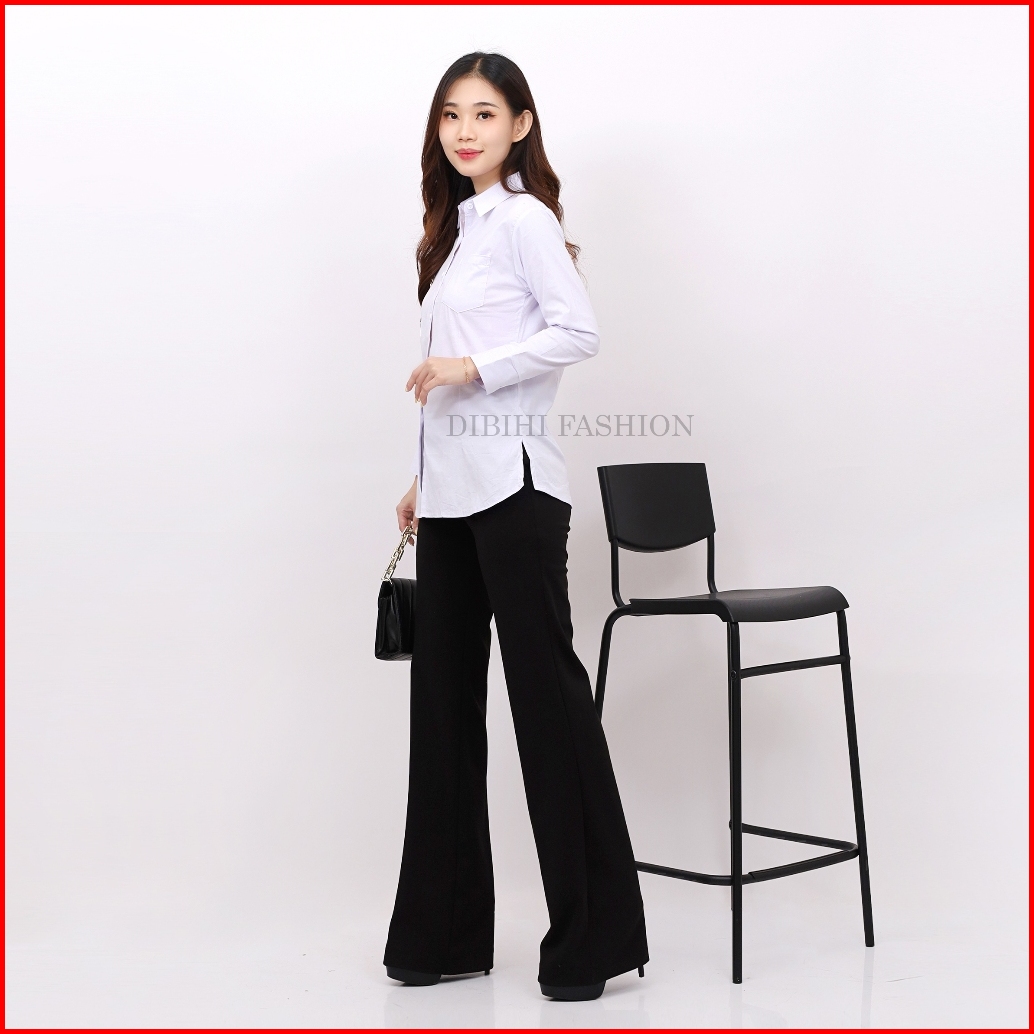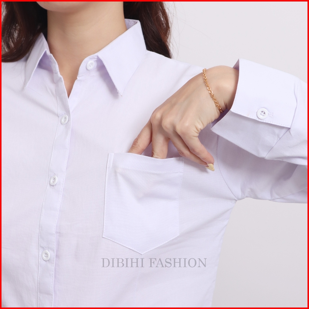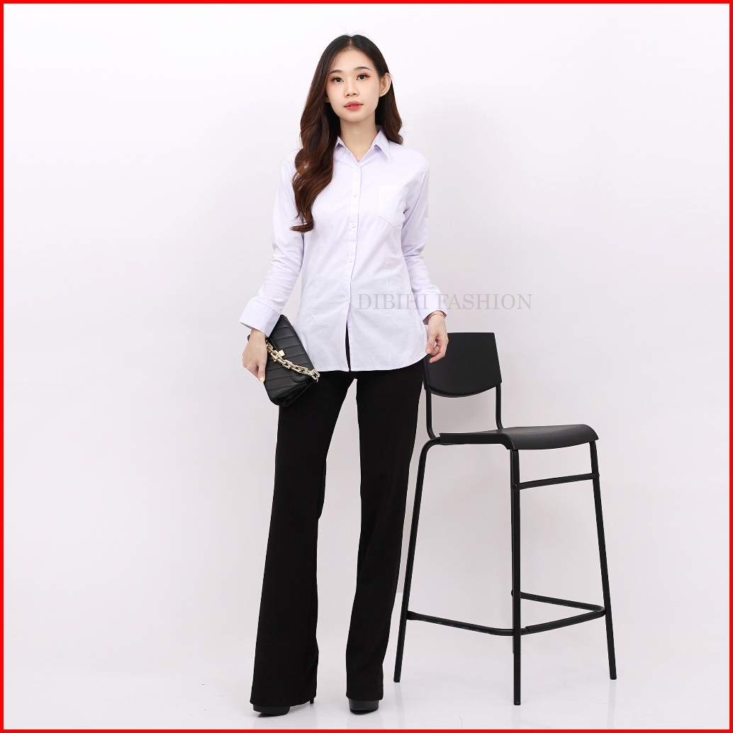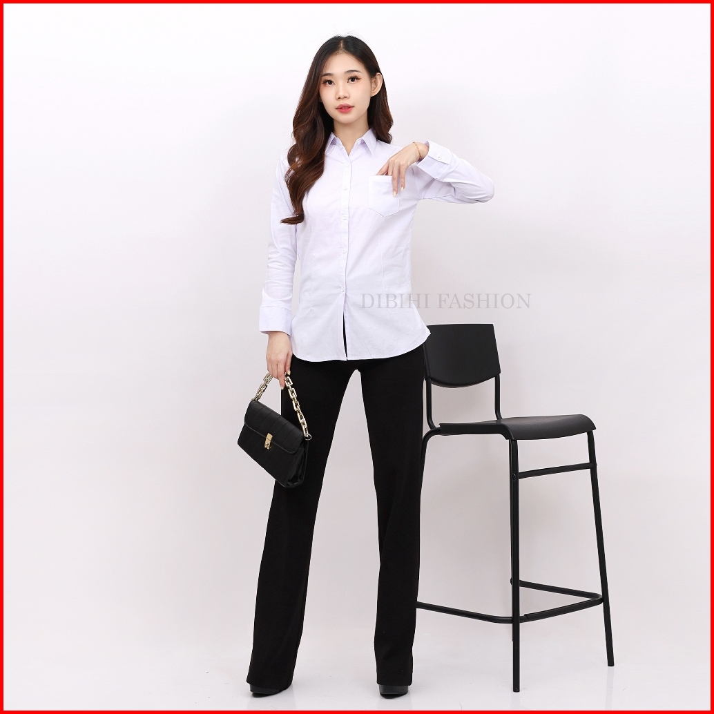 Dibihi Kemeja Putih Polos Kerja Formal Wanita Lengan Panjang Saku 1 Bahan Katun Stretch Melar