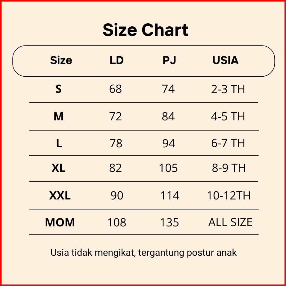 Anak size S, Anak size M, Anak size L, Anak size XL, Anak size XXL, Ibu LD 108