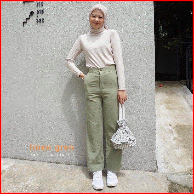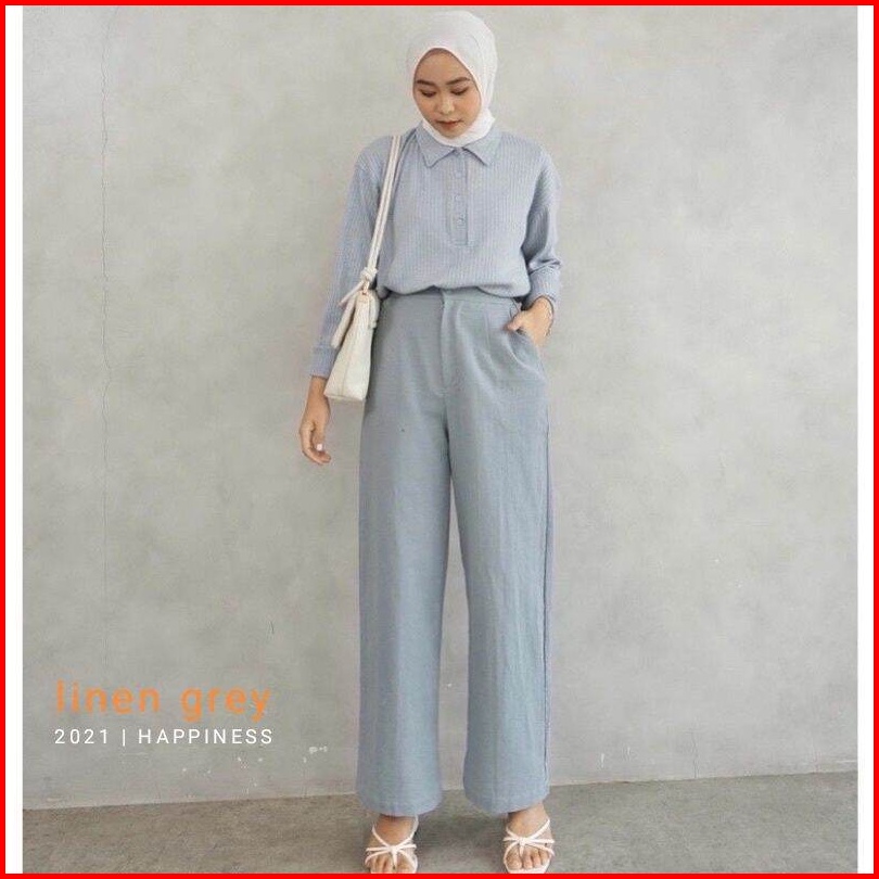 Loose Pants Highwaist Kulot Linen Rami Pinggang Karet Wide Leg Cullote