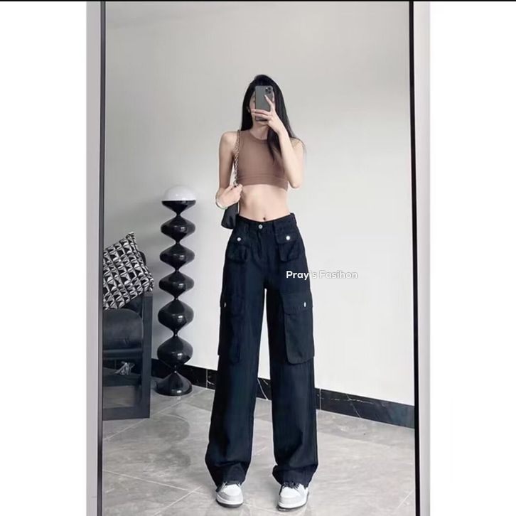 Cargo Denim Pasir Putih Highwaist Loose Celana Jeans Wanita Korea(realpict)