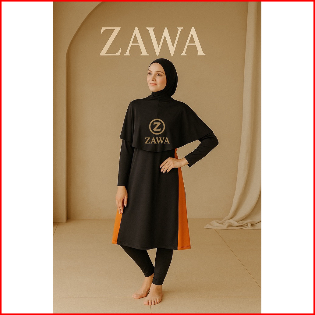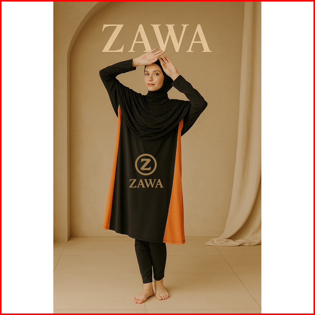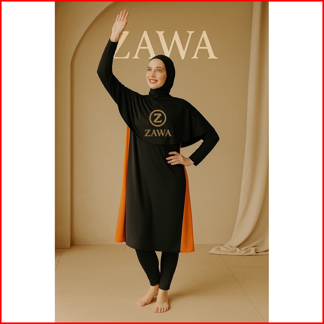 Zawa Tunis Kurta Muslimah Swimwear Black Orange - Baju Renang Muslimah Hijab Syari Sporty Remaja Perempuan