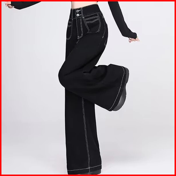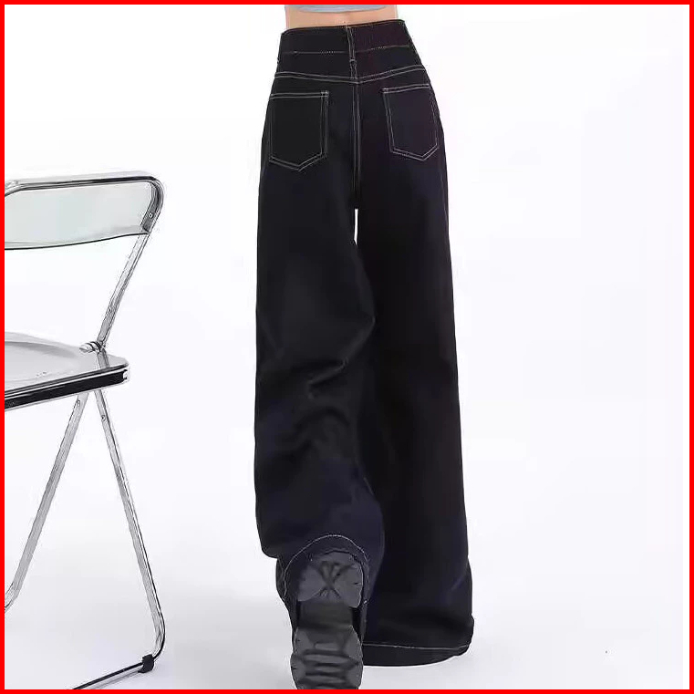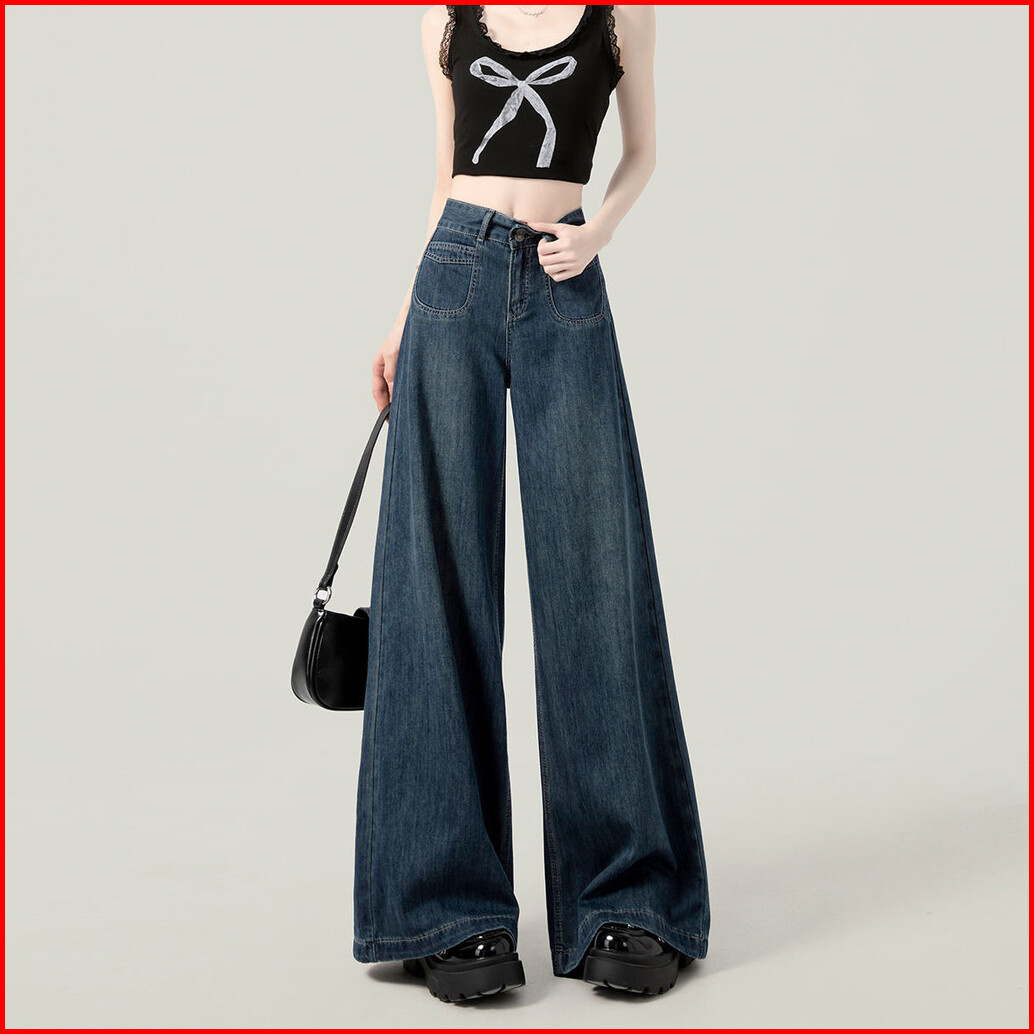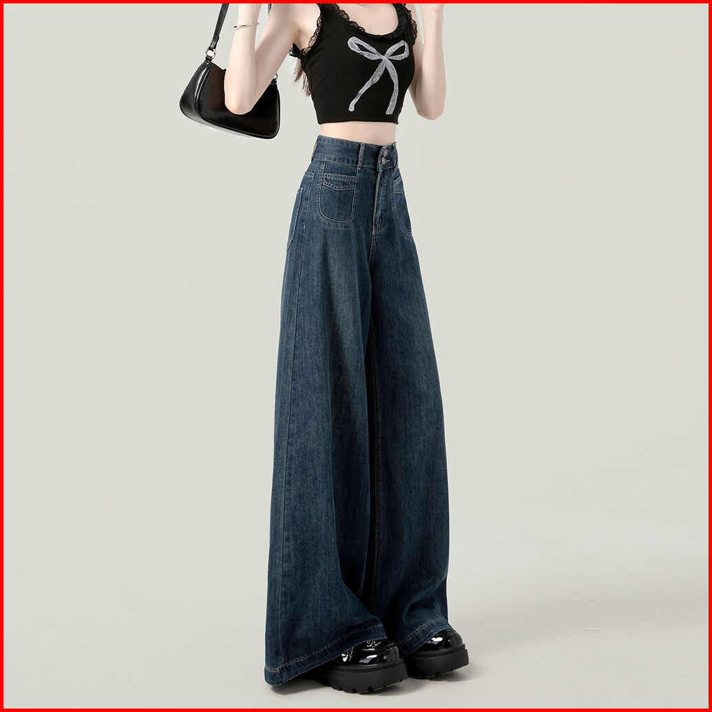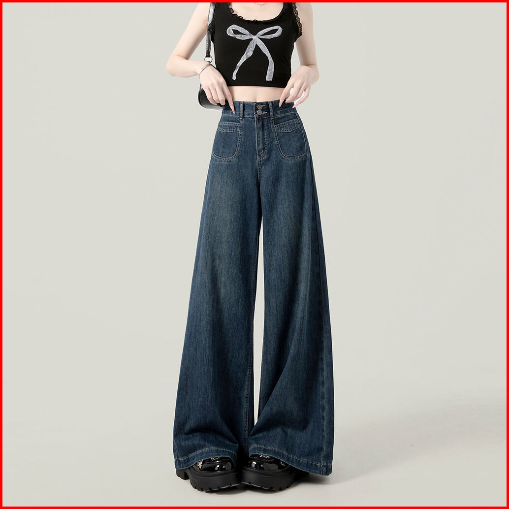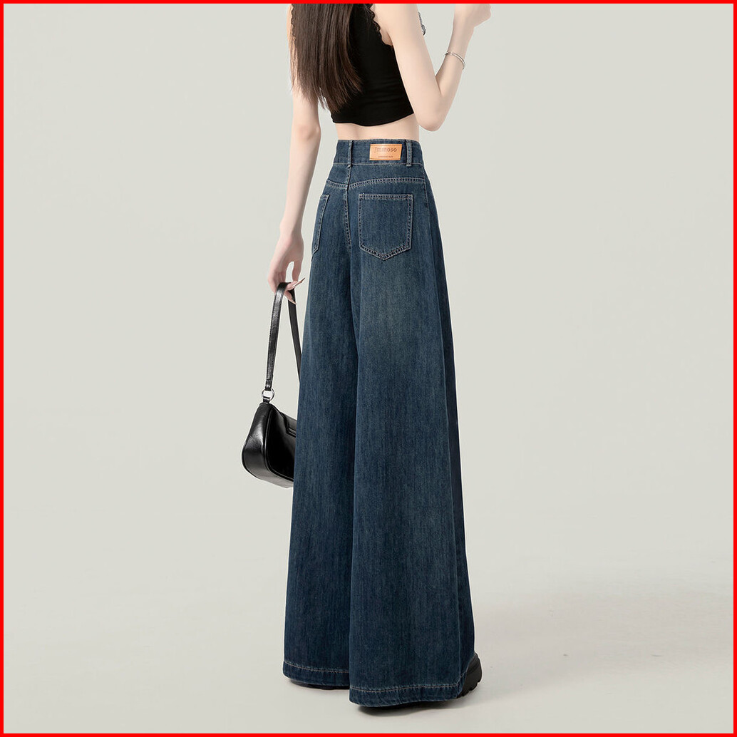 Yuruma Biru Retro Highwaist Celana Jeans Wanita Loose Kekinian Kaki Lebar