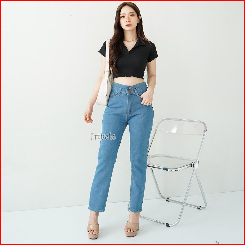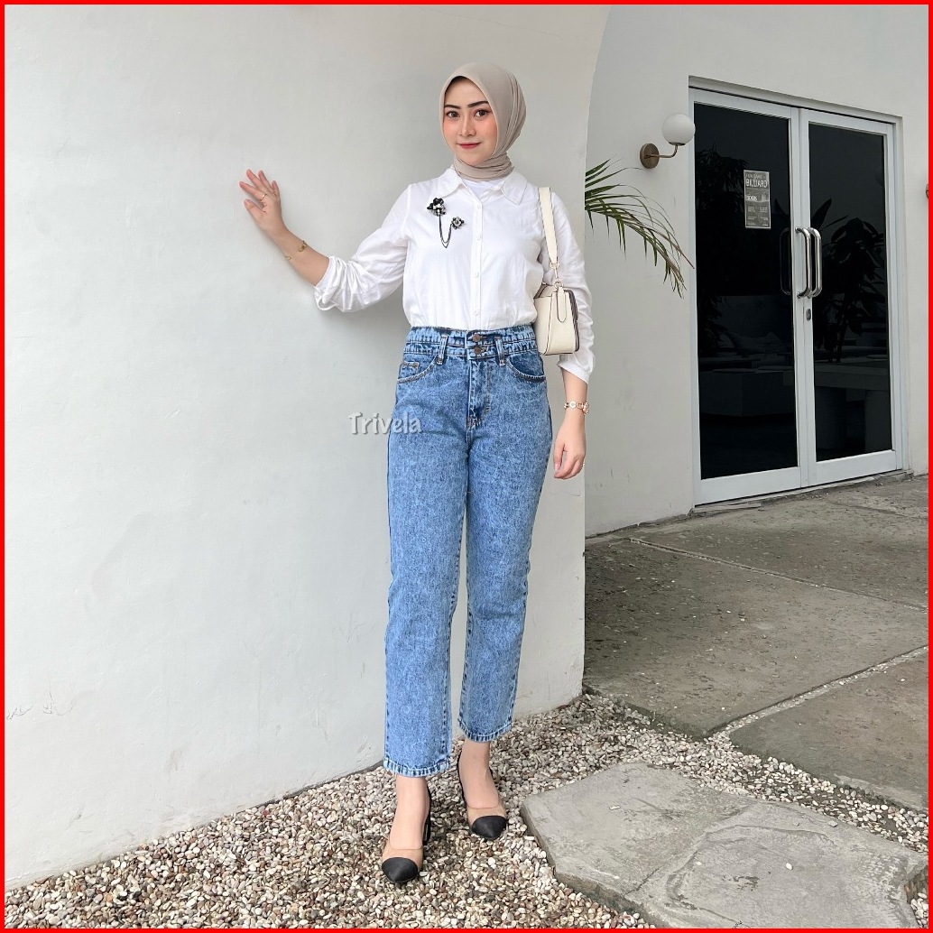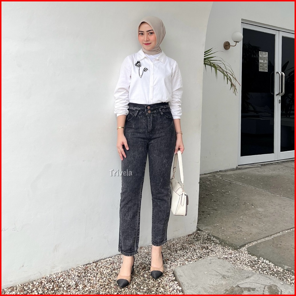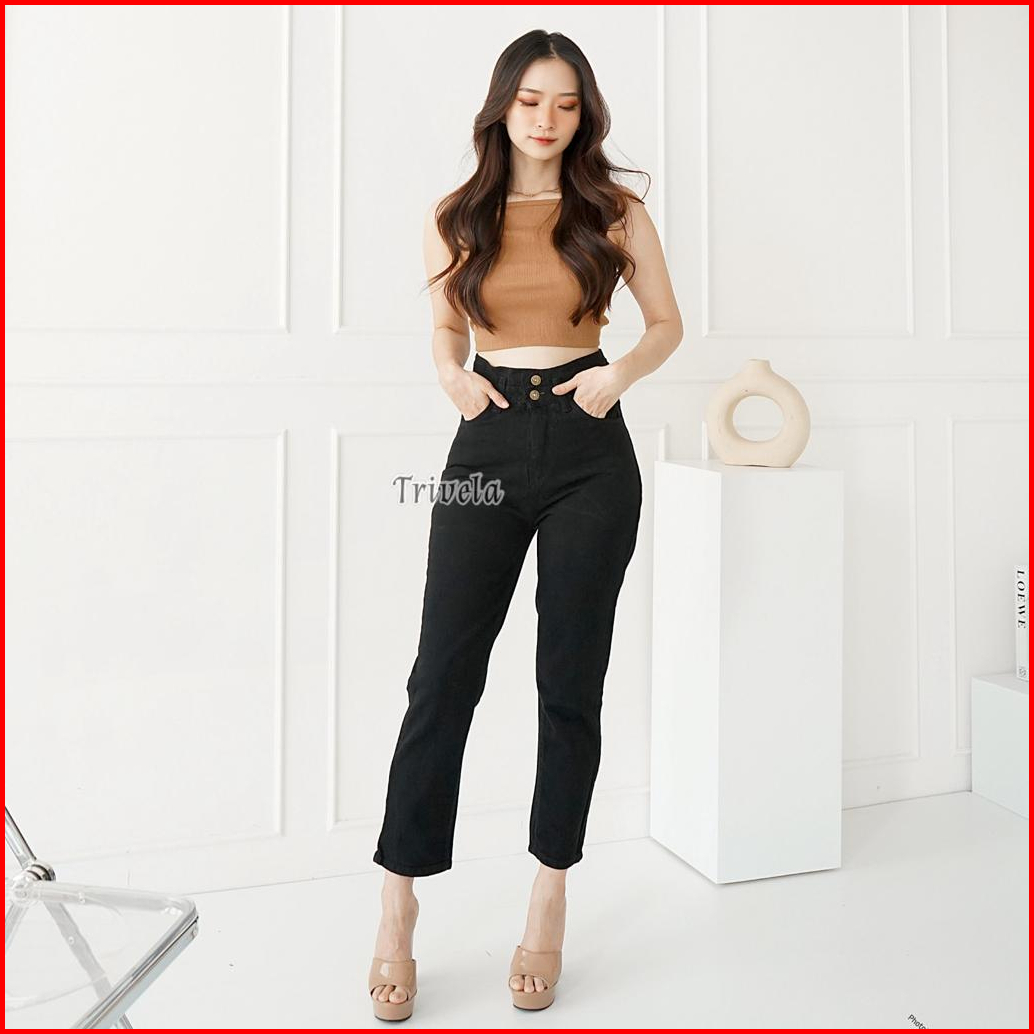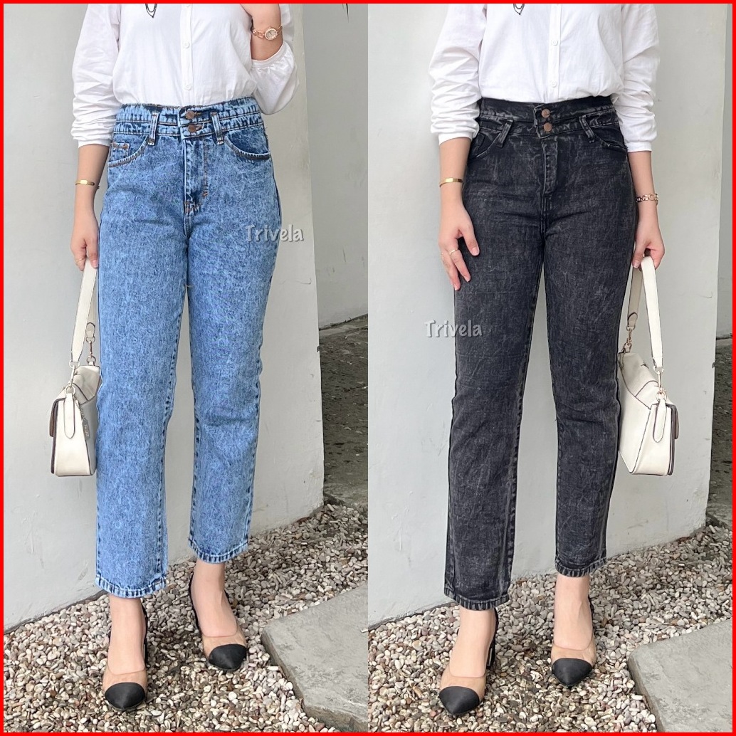 Trivela - Celana Jeans Boyfriend 2 Kancing Celana Jeans Wanita Highwaist Snow Celana Jeans Wanita Korean Style Neville