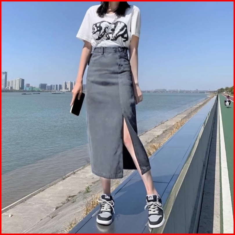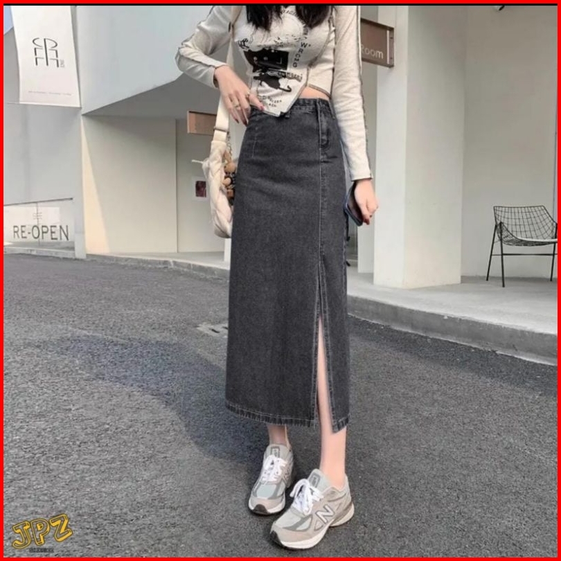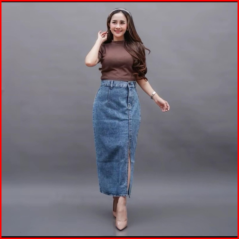 Rok Jeans Wanita Korean Style Higwaist Belah Samping Rok Midi Lenght A-line