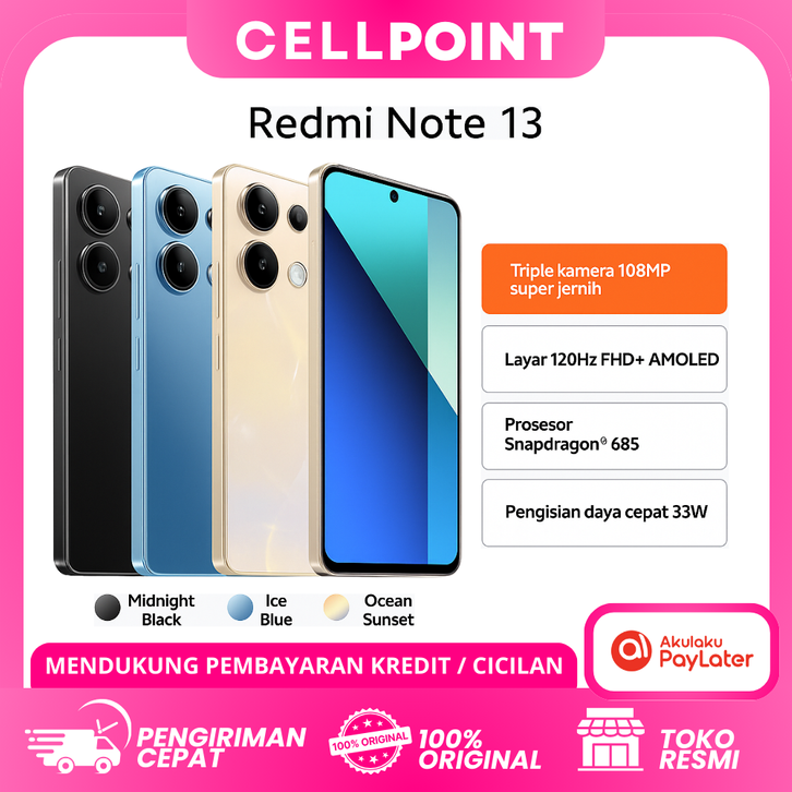 HP XIAOMI REDMI NOTE 13 (8GB/128GB) (8GB/256GB) LAYAR 120 HZ FHD+ AMOLED TIGA KAMERA 108 MP SNAPDRAGON 685 ORIGINAL