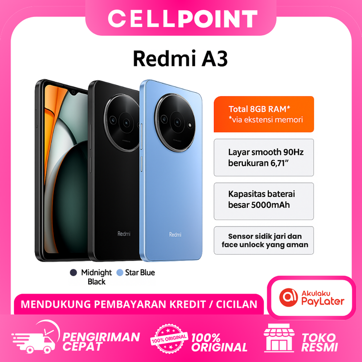 HP XIAOMI REDMI A3 (4GB/128GB) LAYAR MULUZ 90 HZ SENSOR SIDIK JARI & FACE UNLOCK DESAIN INOVATIF ORIGINAL OFFICIAL STORE