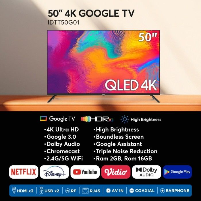 TUTU Google TV - QLED 4K Smart TV 50 inch - Dolby Adio - HDR 10 - Google Assistant - IDTT50G01