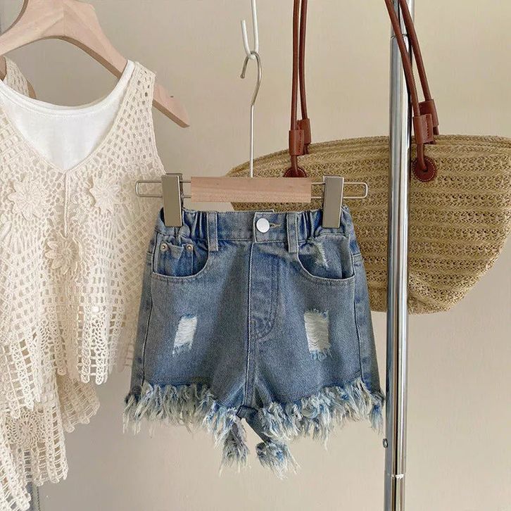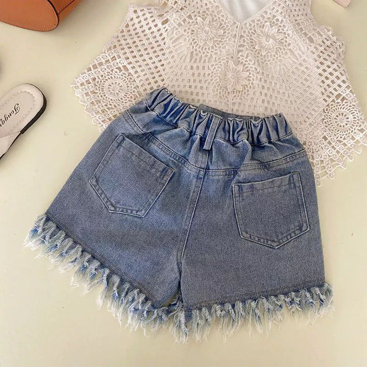 SETELAN 3 IN 1 BAJU ATASAN RAJUT CELANA PENDEK JEANS FASHION ANAK PEREMPUAN - MOTIF FLOWER EMBROIDERY
