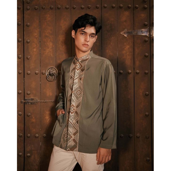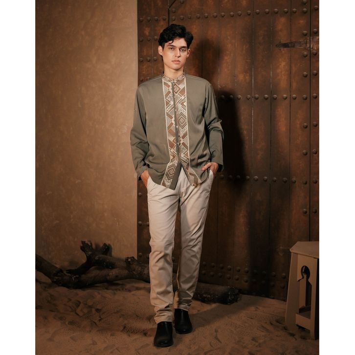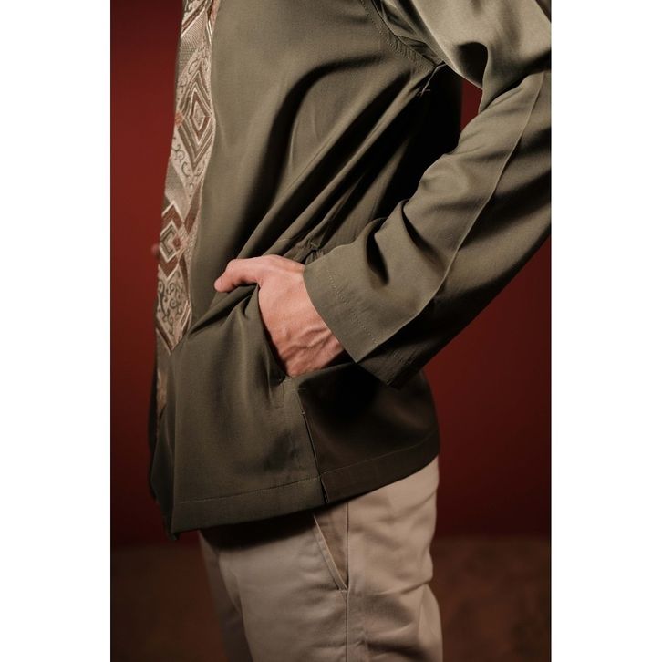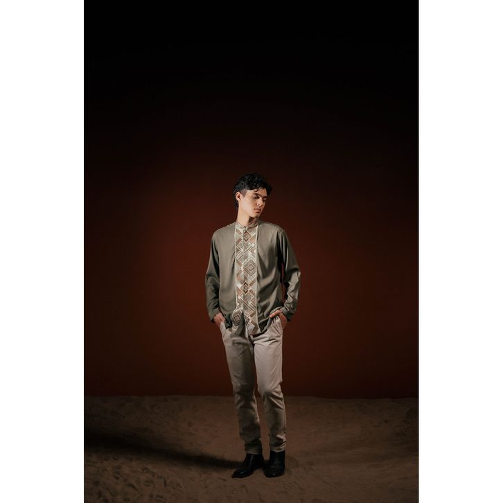 LARUSSO Kemeja Koko Bordir Lengan Panjang Pria - Olive Green