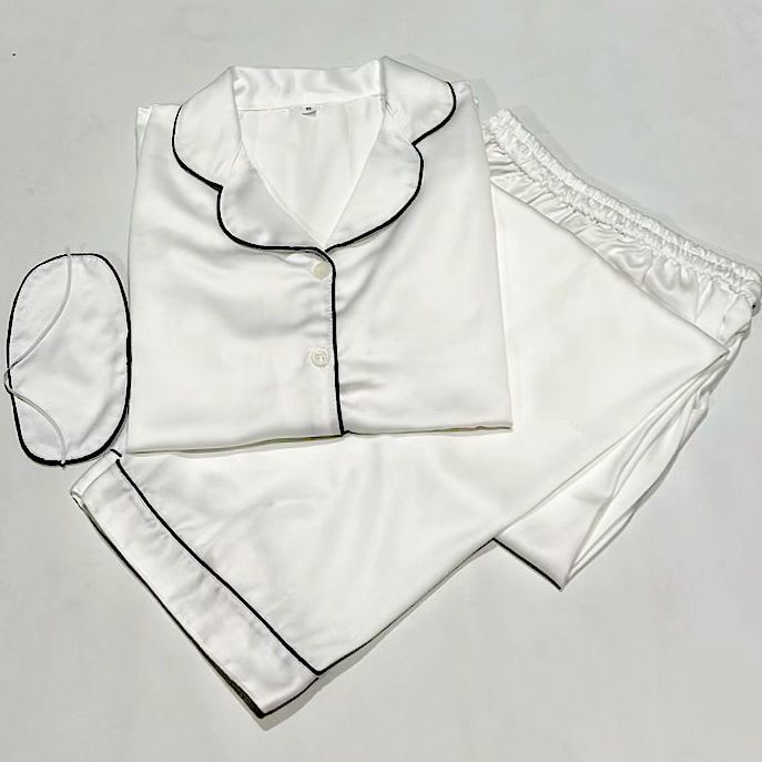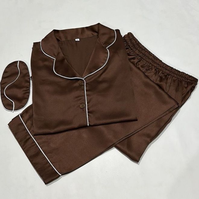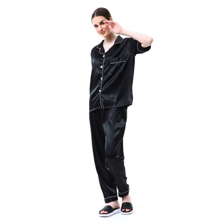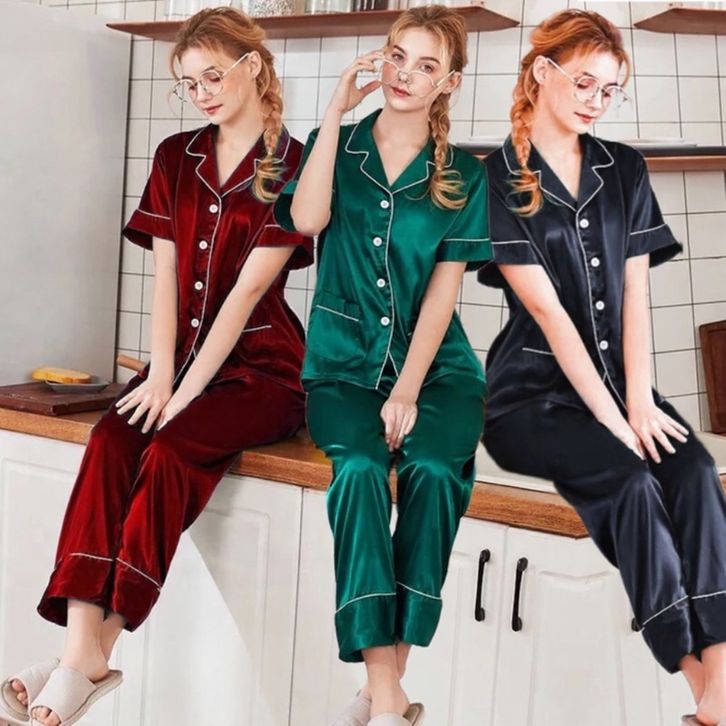 Baju Tidur Wanita Dewasa Setelan Piyama Satin Set Korea Kancing Lengan Pendek Celana Panjang Motif Polos