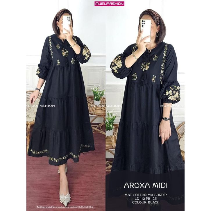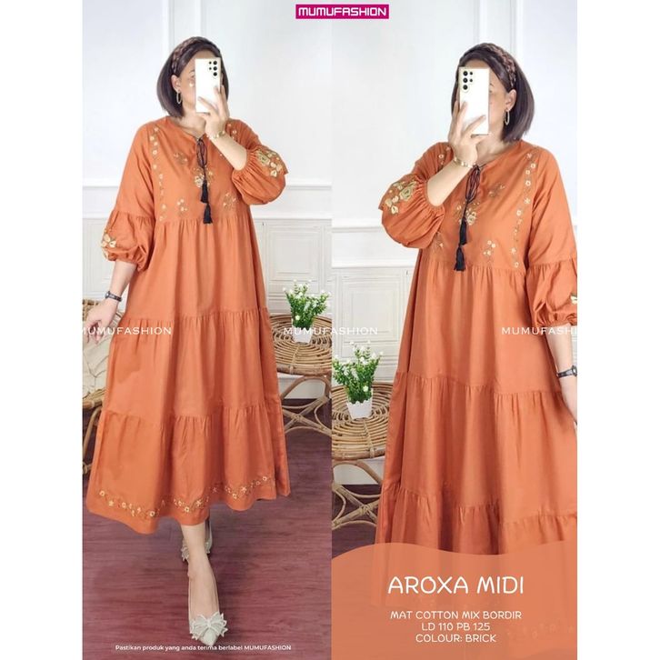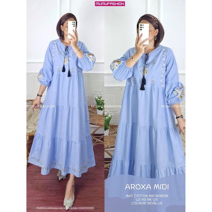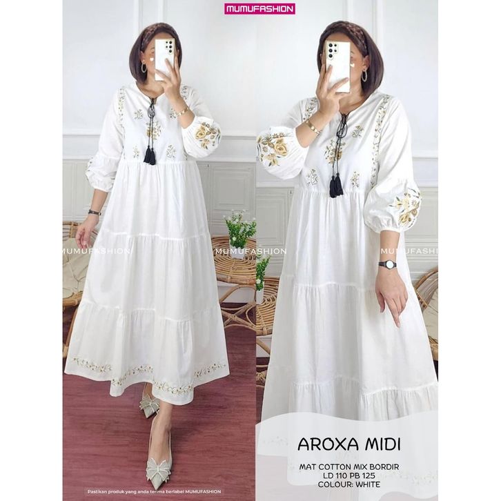 RATI - AROXA MIDI Dress Wanita Bahan katun Bordir Premium Jumbo LD110 by Mumu Fashion Solo