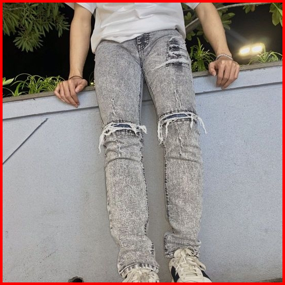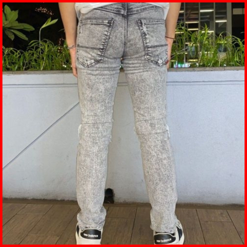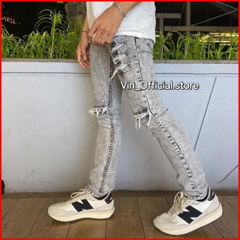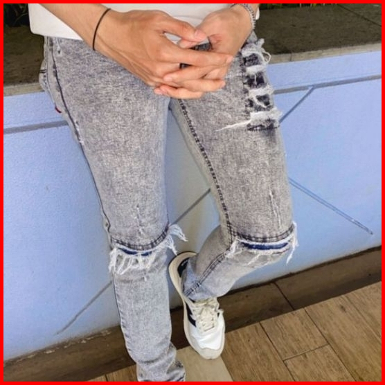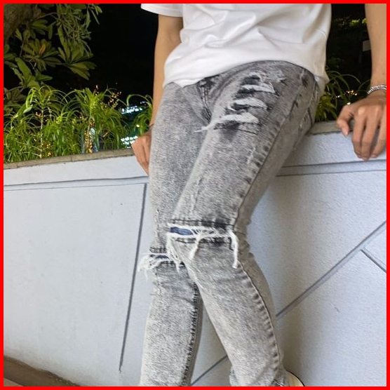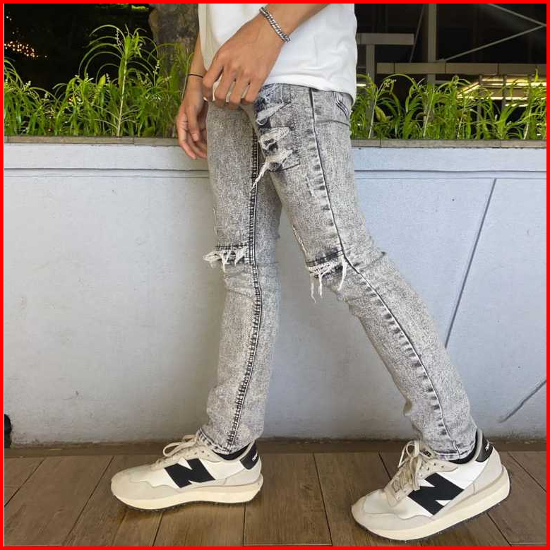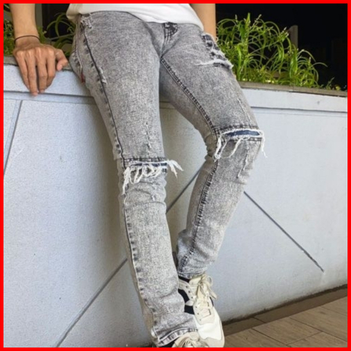 Celana Jeans Pria Bikers Ripped Grey Sandwash Sobek Lutut Slimfit Stretch Soft Jeans Karet Skinny Fit